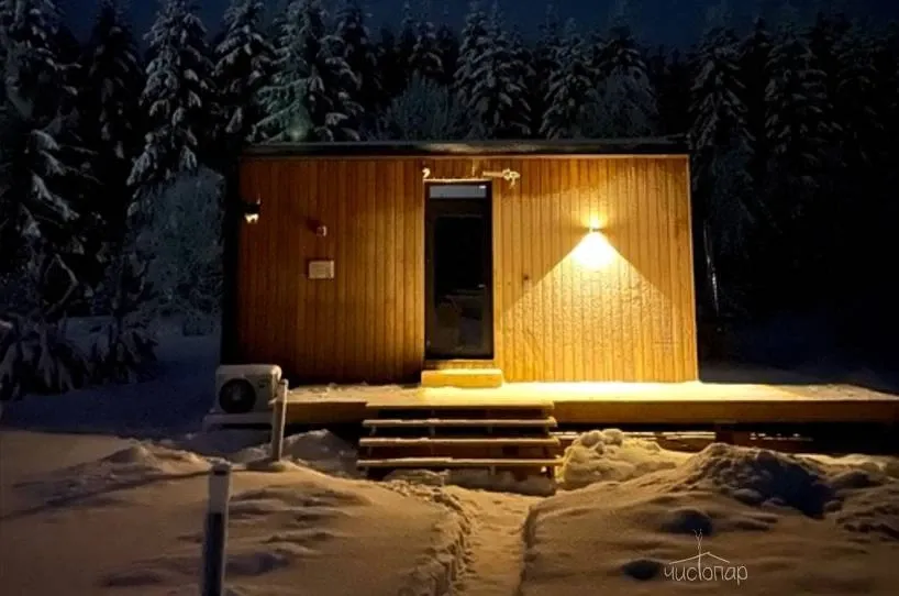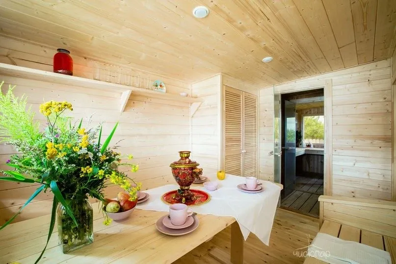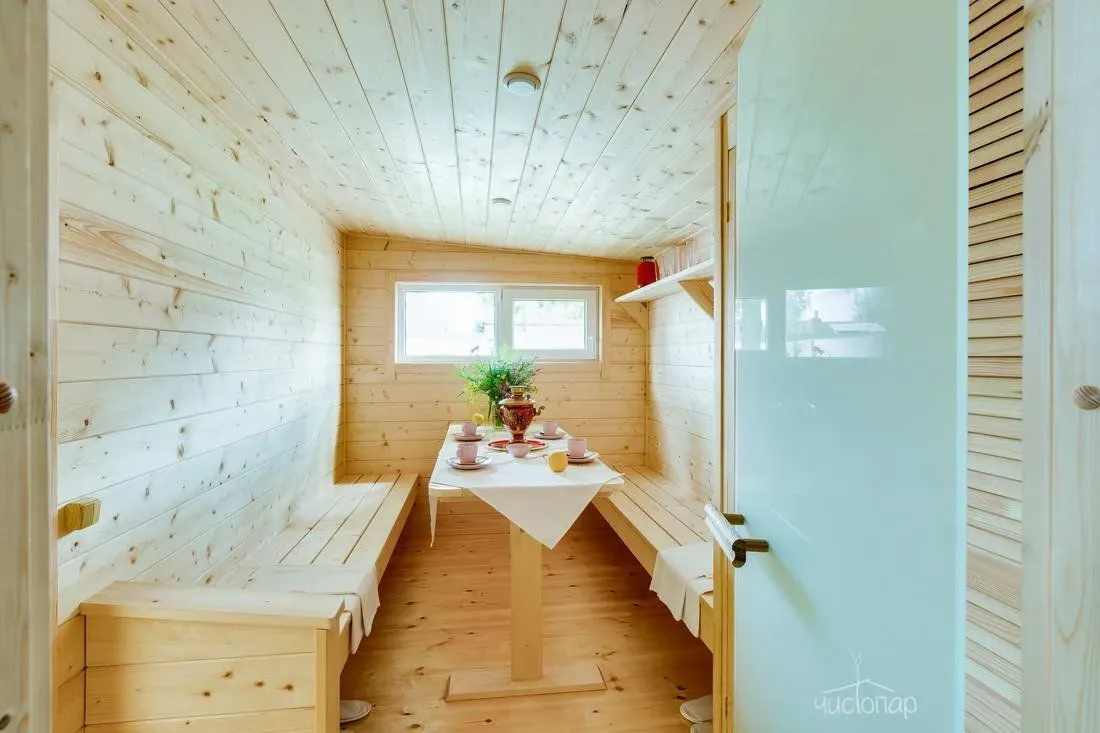 На территории глэмпинга есть кедровая банька с березовым веничком и горячая купель на улице.