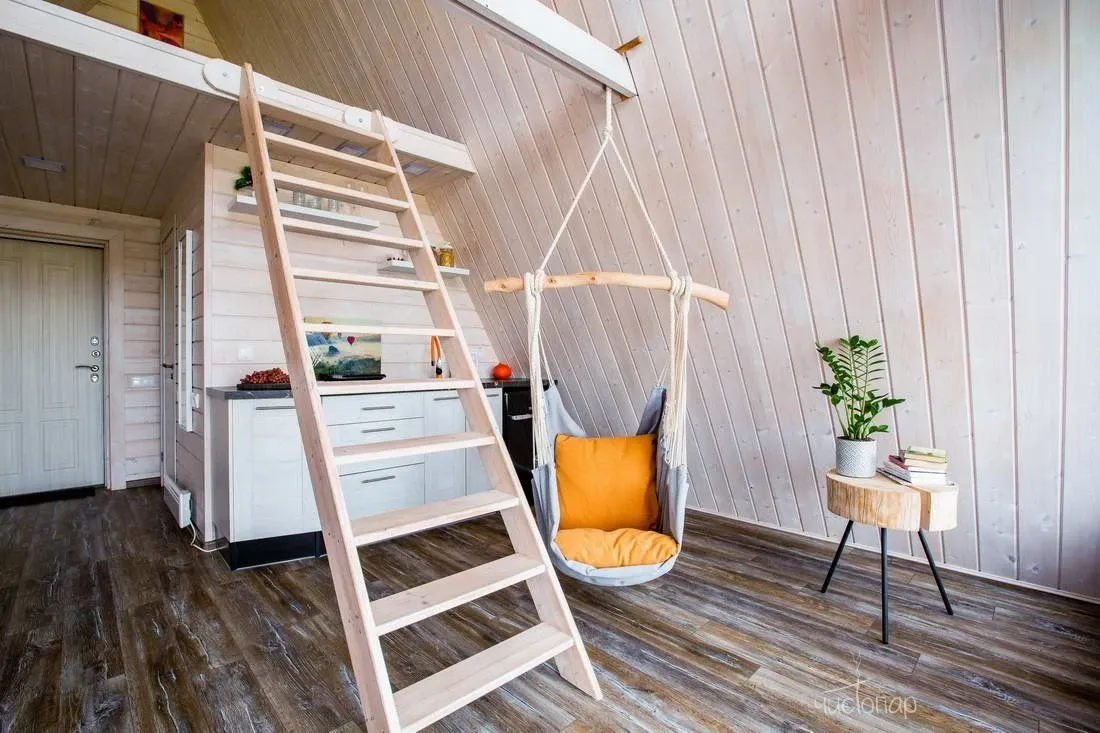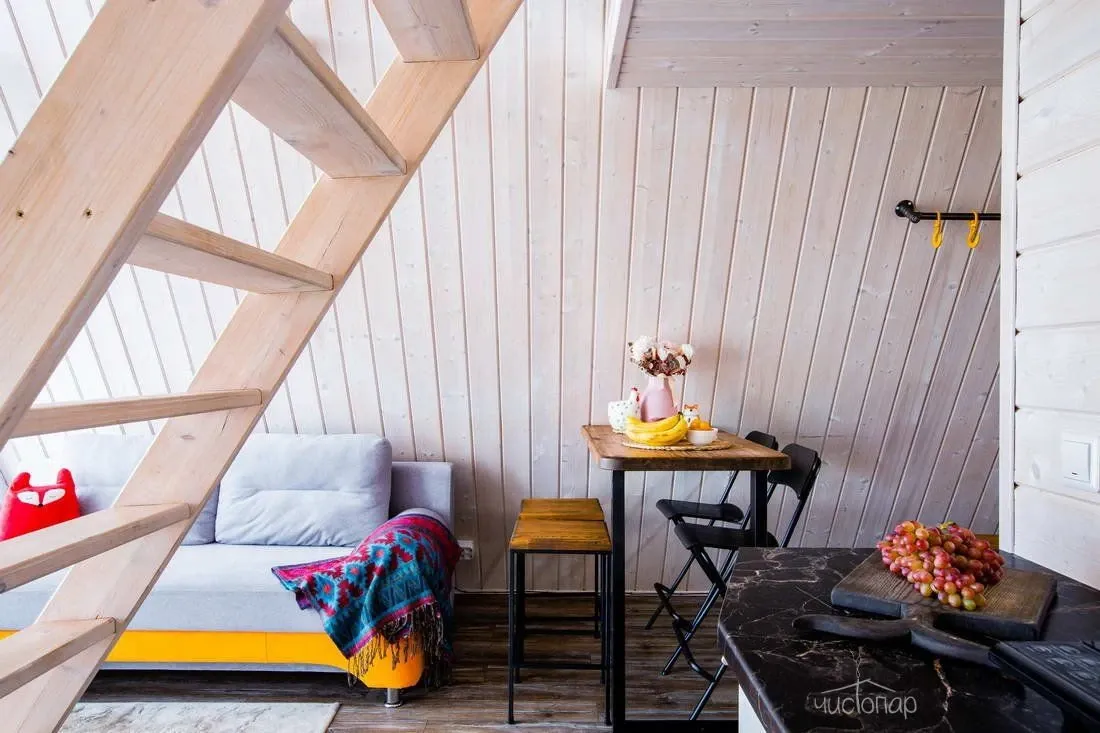 На первом этаже есть раскладной диван, где лежит красивая Лиса в шалаше. На втором – просторное и уютное спальное место.