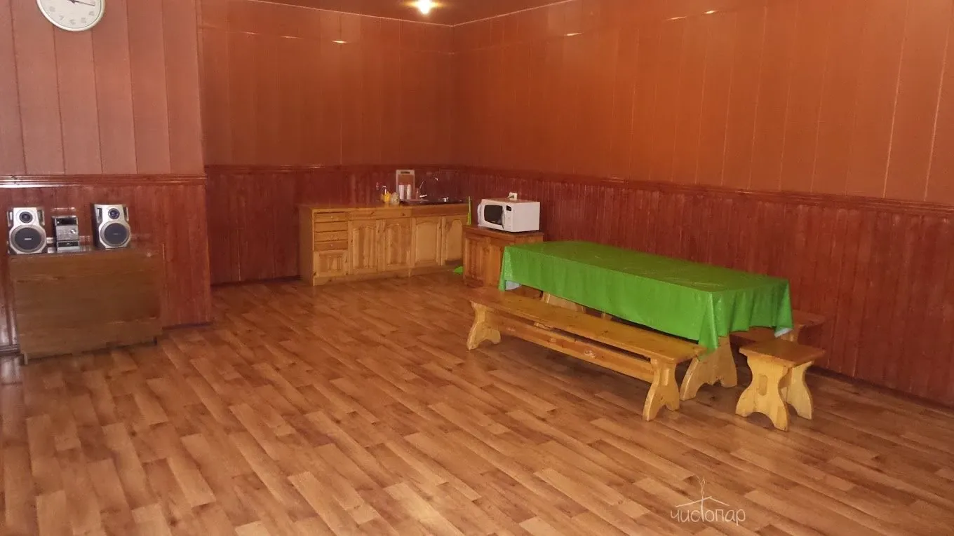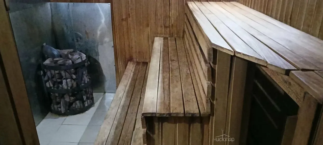 Общественная баня: русская парная на дровах, турецкая парная (хаммам), финская парная. Бассейн. Банные принадлежности. Комната отдыха: ТВ, аудиоцентр, кухонная зона, обеденная зона.