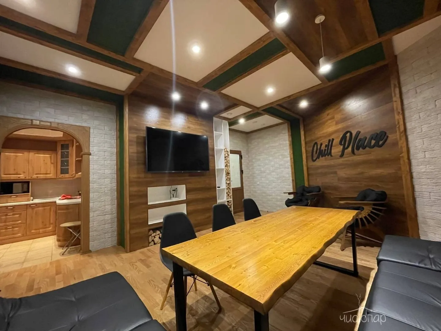 Сауна «Chillplace» с русской парной, бассейном, купелью. Комфортная комната отдыха с TV/DVD, Wi-Fi. Кухонная зона со всем необходимым.