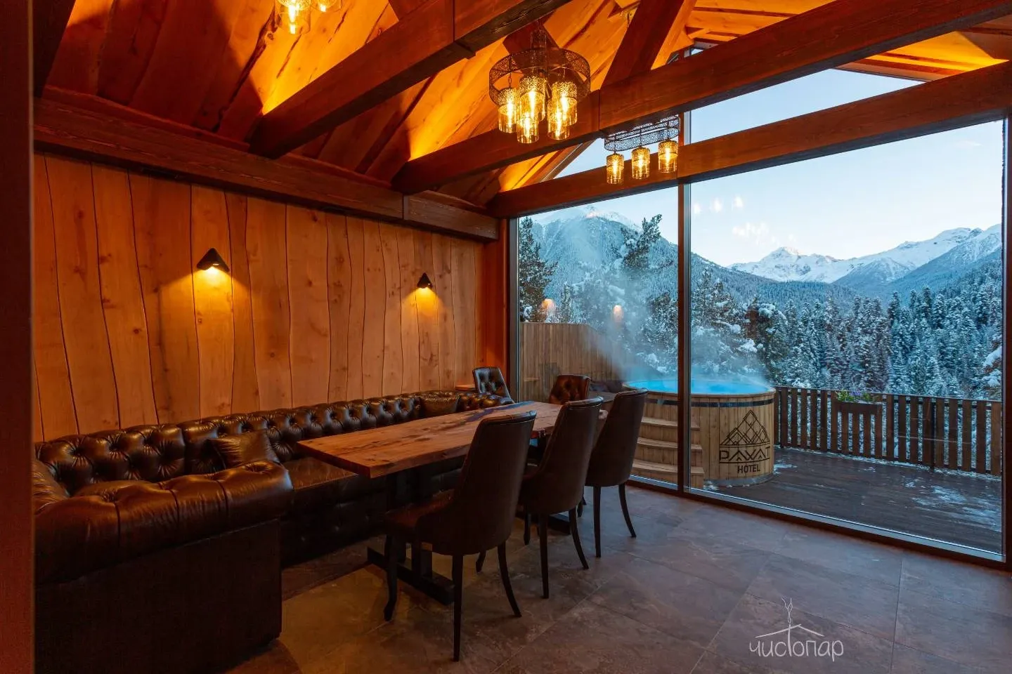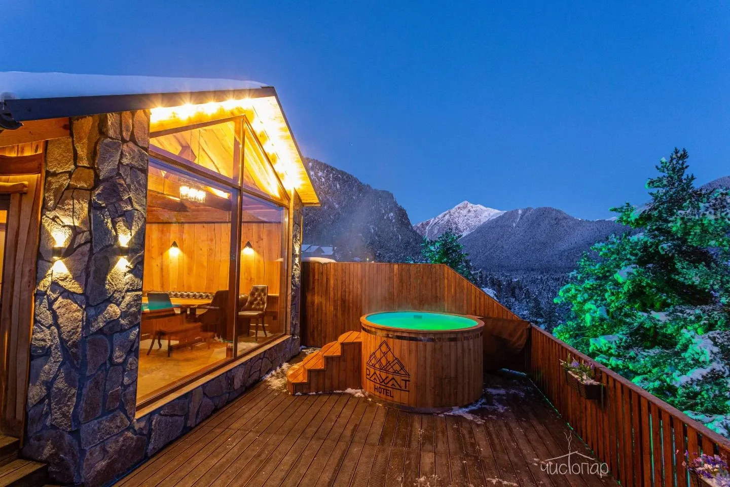 В Rahat Hotel гостям предлагается посетить настоящую русскую баню на дровах и чан под открытым небом с самым потрясающим видом!