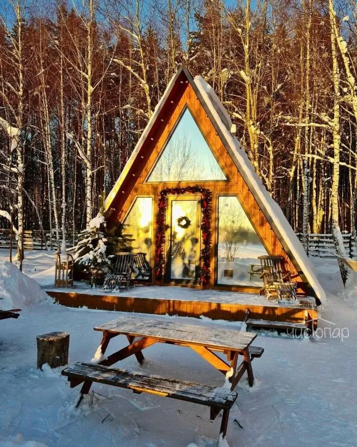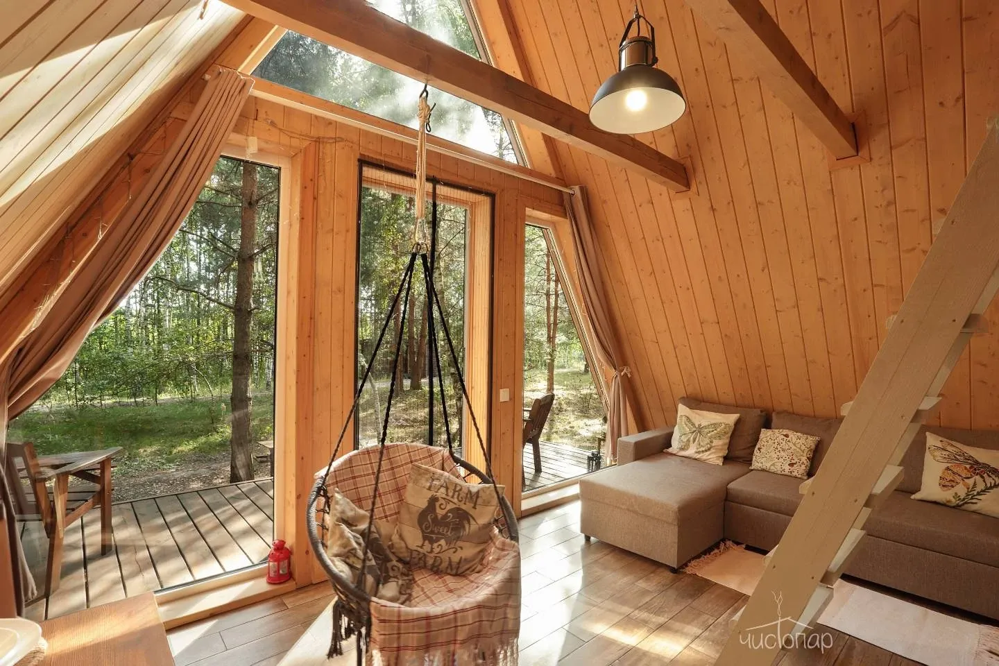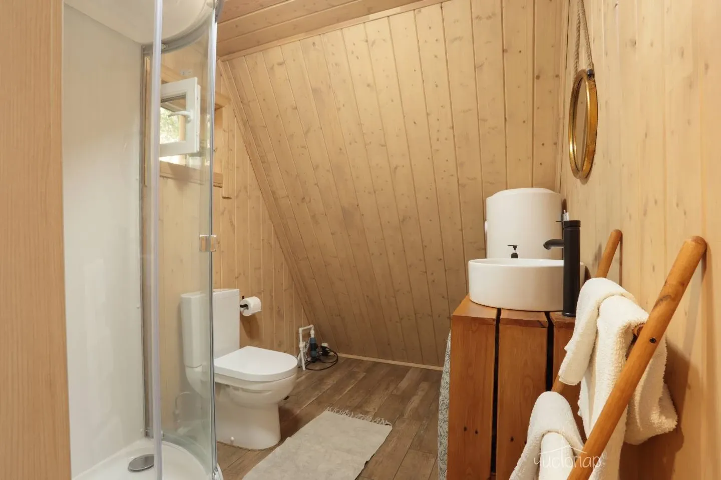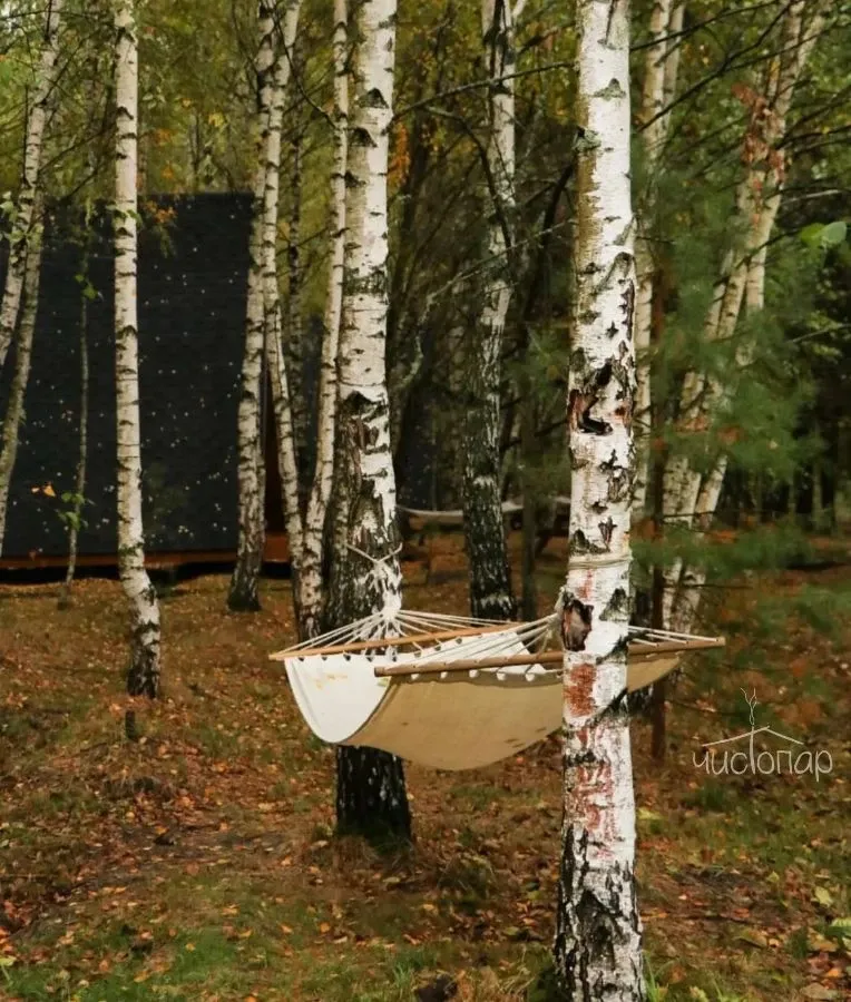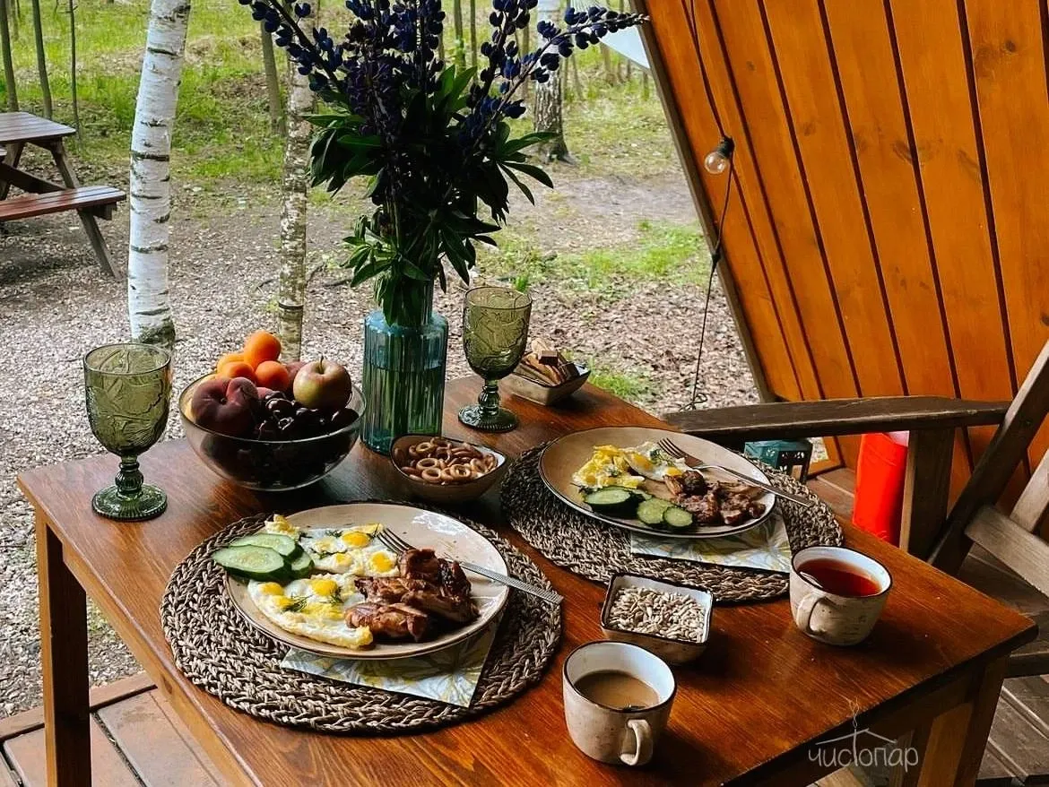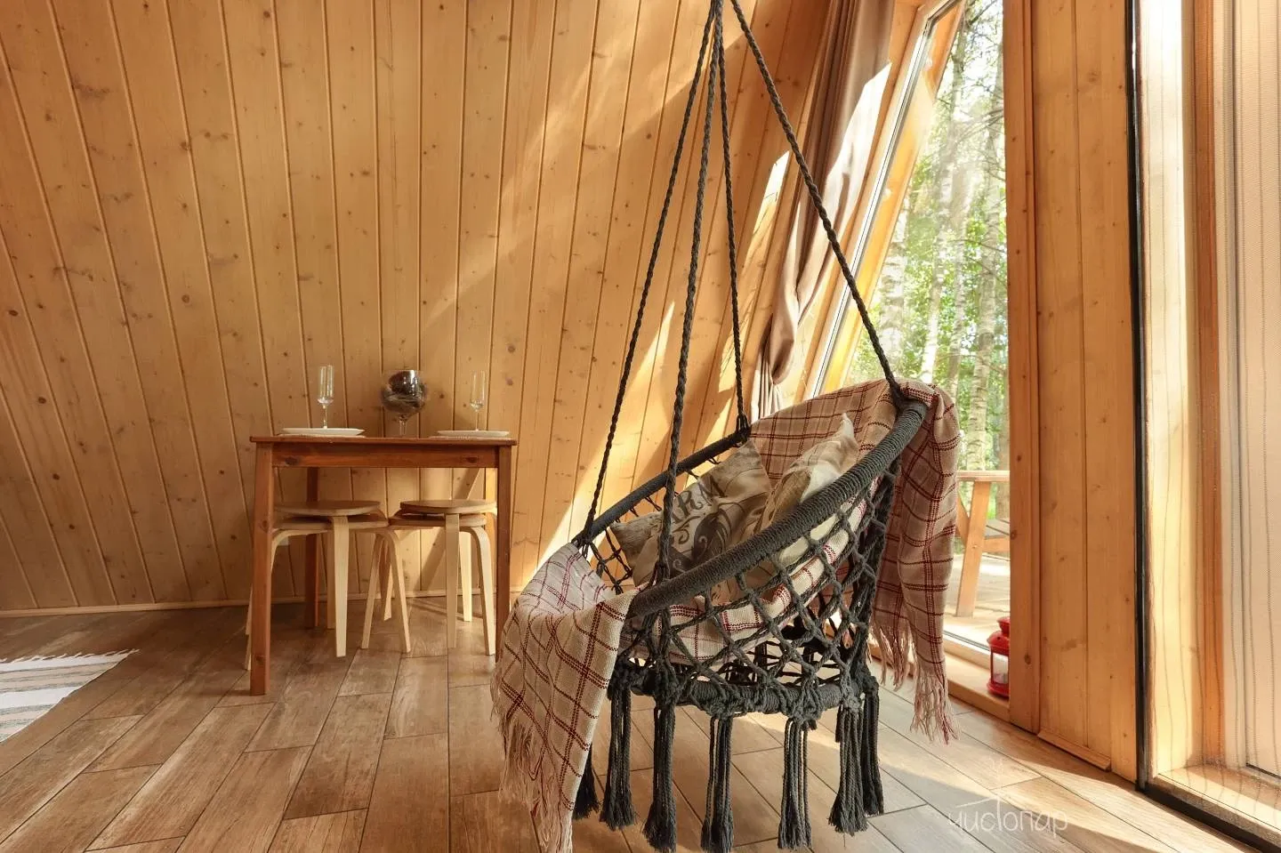Для проживания предоставляются треугольные домики со всеми удобствами. У каждого домика есть зона барбекю, стол со скамейками и гамак. Дополнительно можно приобрести уголь и розжиг.