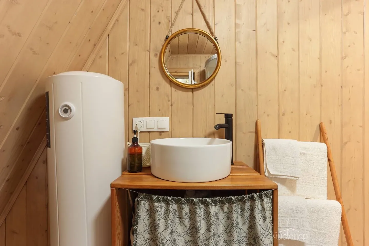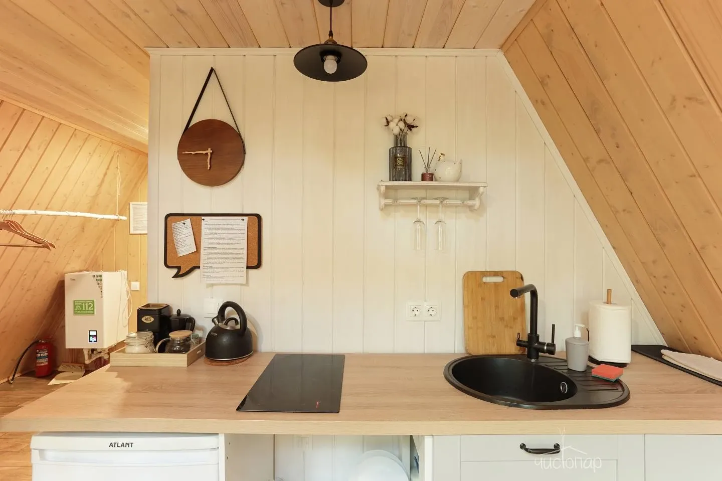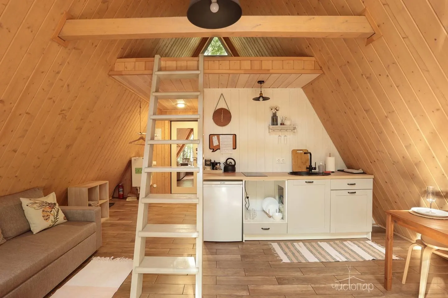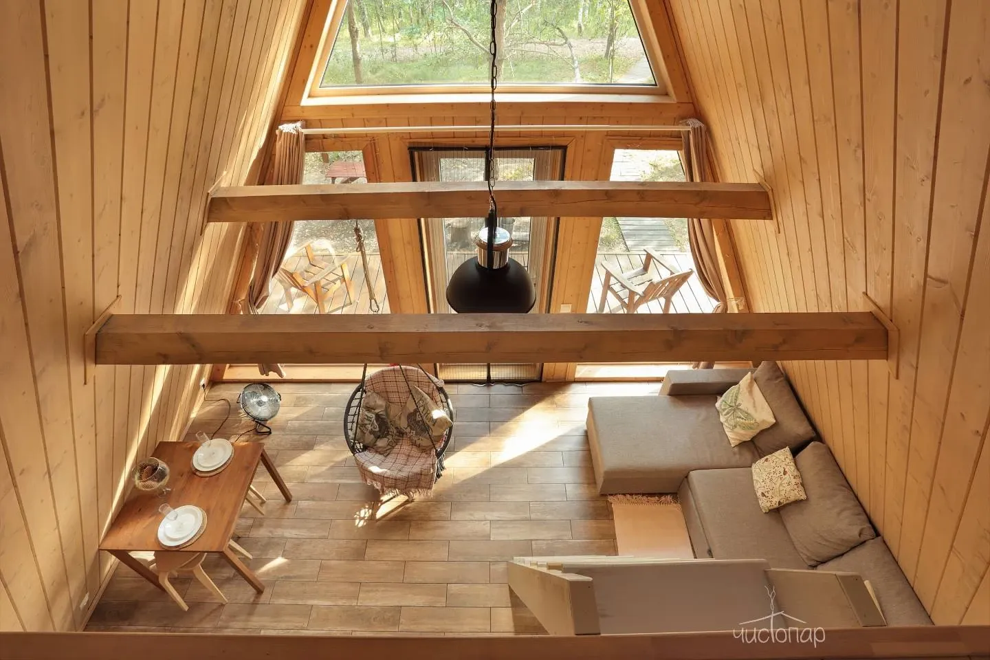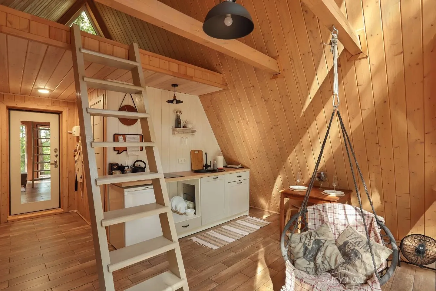 Для проживания предоставляются треугольные домики со всеми удобствами. У каждого домика есть зона барбекю, стол со скамейками и гамак. Дополнительно можно приобрести уголь и розжиг.