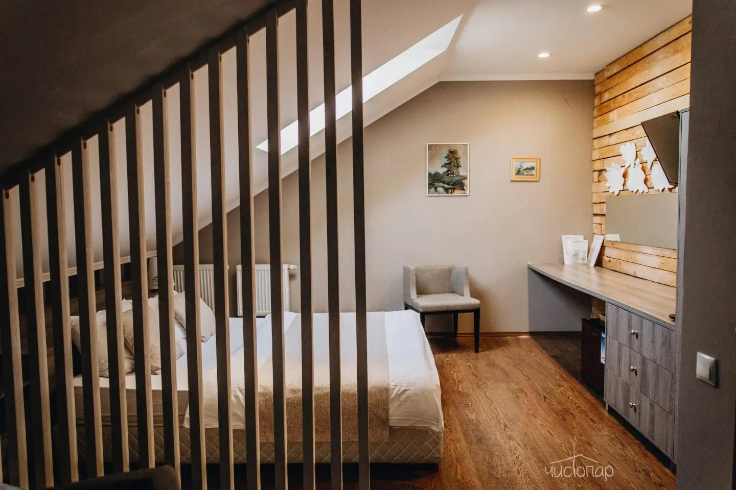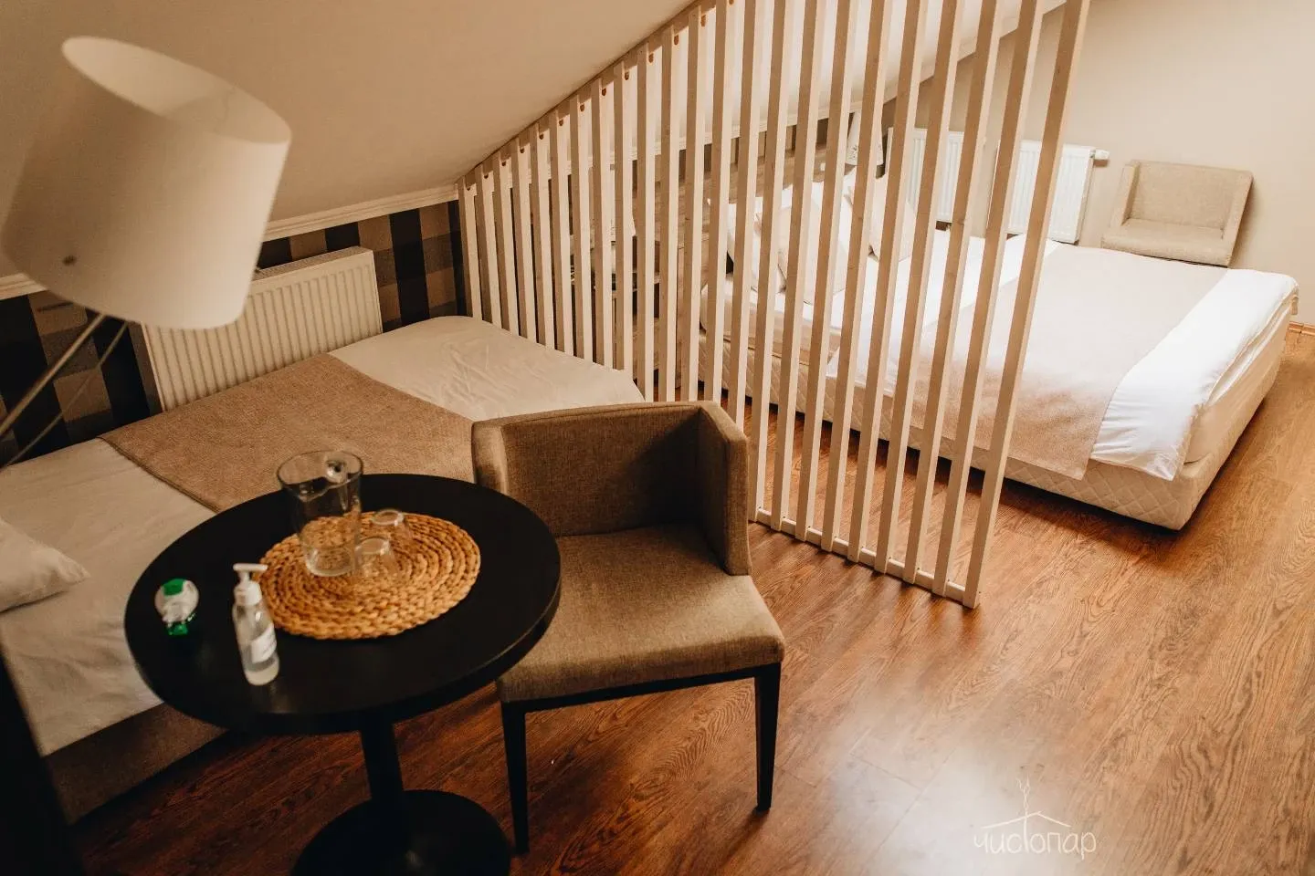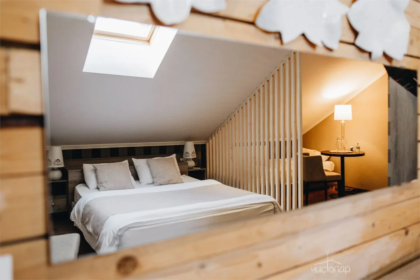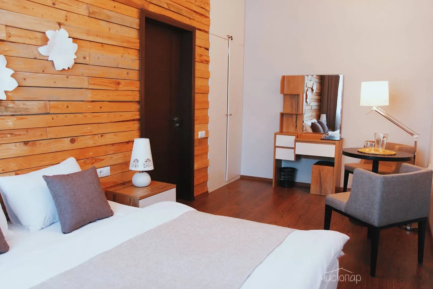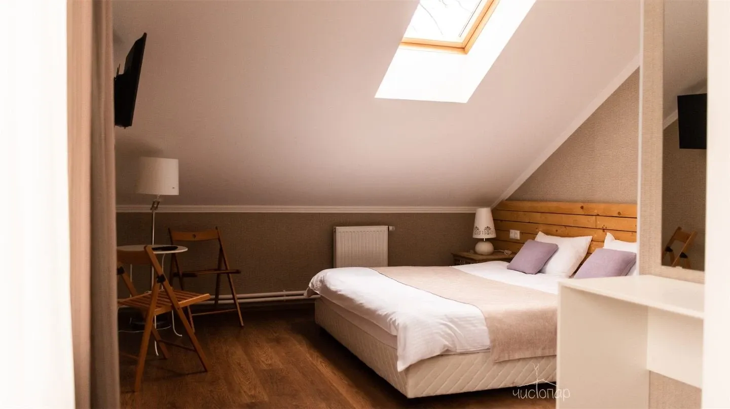 Двухэтажные апартаменты рассчитанные до четырех человек. Номер с двумя двуспальными кроватями и отдельной ванной комнатой, уютно оформленный деревом и камнем. Также в номере есть телевидение, бесплатный Wi-Fi, шкафы для одежды, столик, зеркало, микроволновая печь.