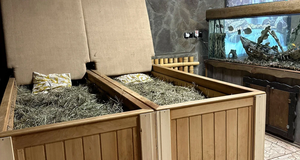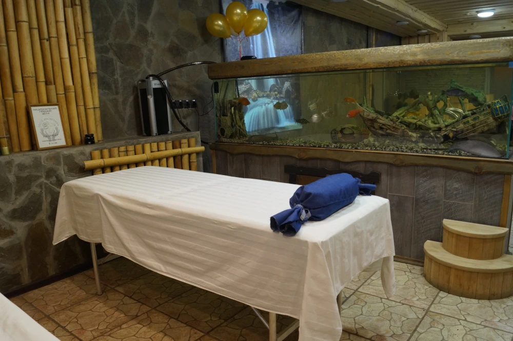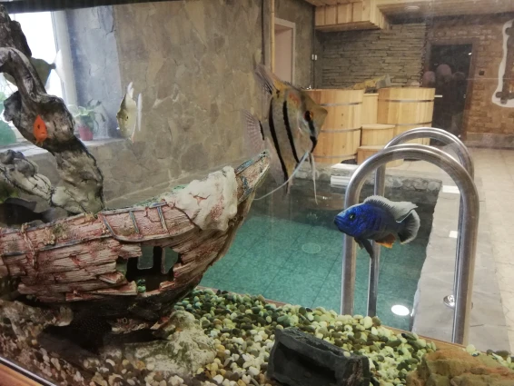 Банный комплекс: уникальные бани – терема построены из благородных пород дерева и даже стены в них обладают целебным действием. Гостей ждет настоящая русская печка, деревянная мебель ручной работы, молодильный чан, самовар, система караоке и отличное настроение, которые помогут создать местные профессиональные банщики и массажисты.