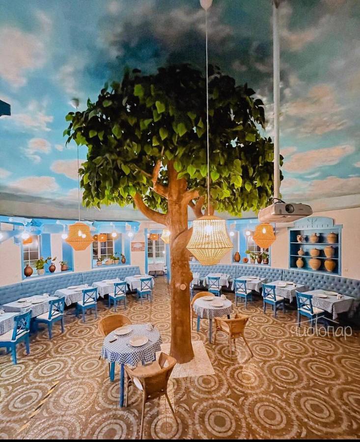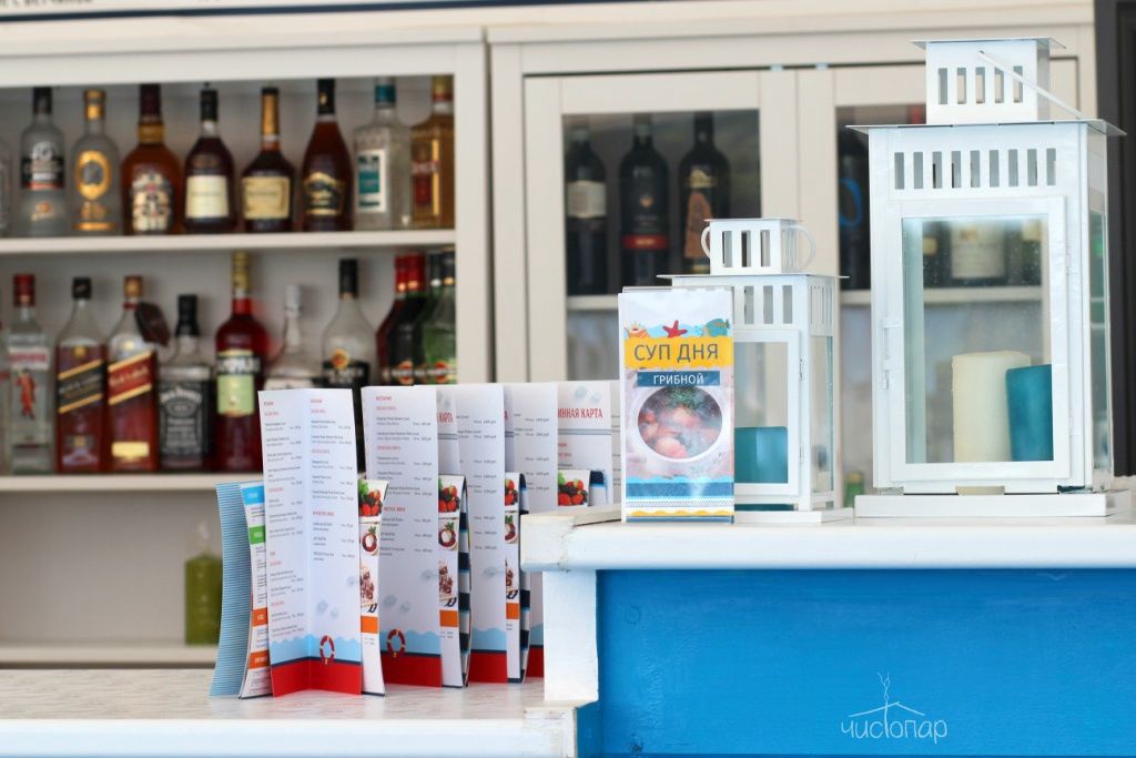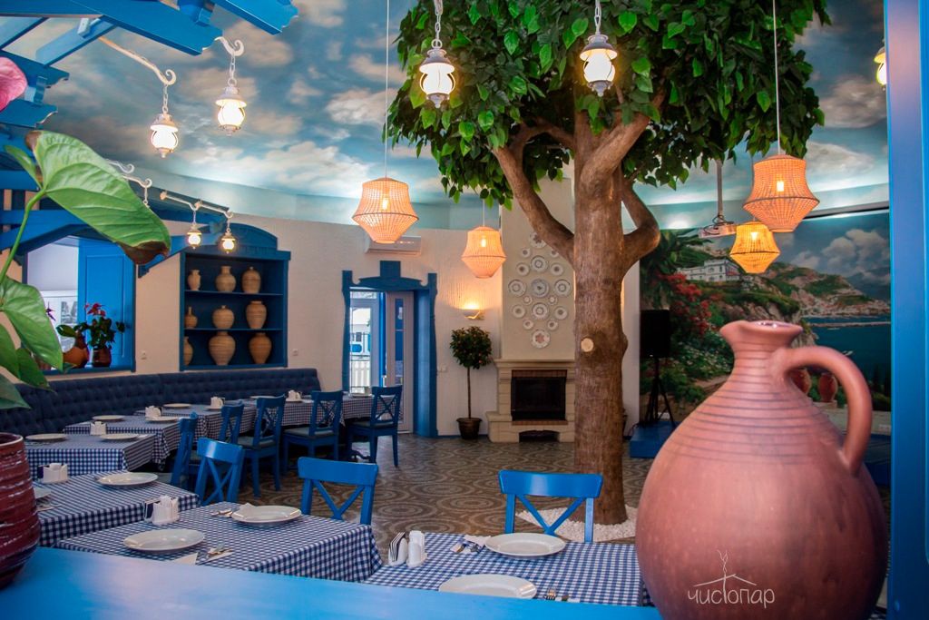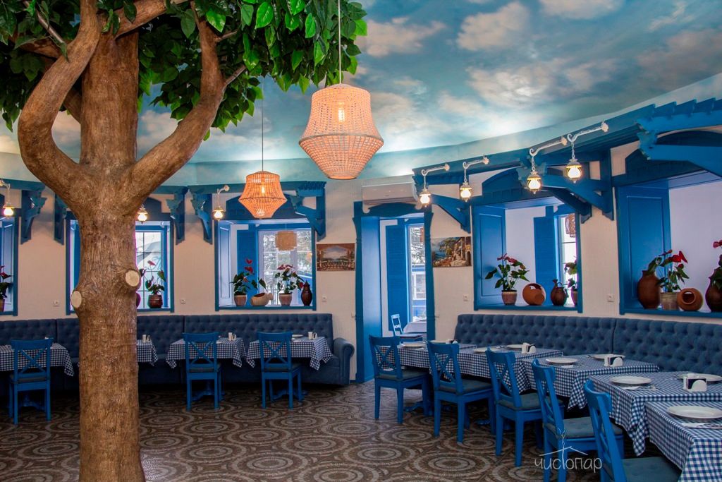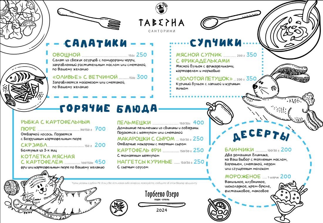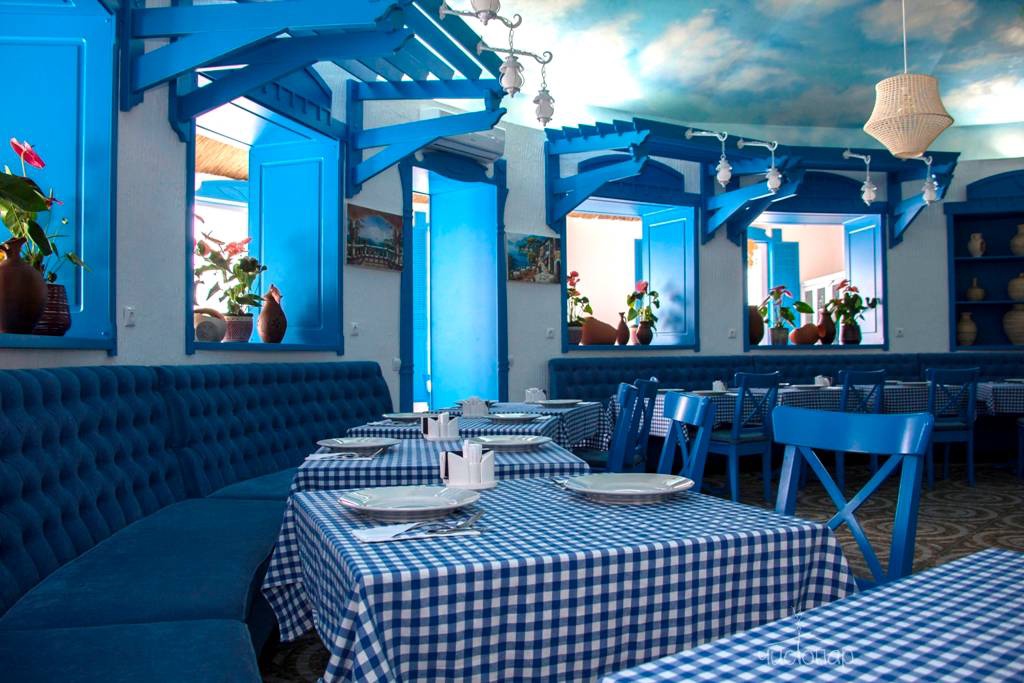 Каждое утро гостей ждёт континентальный завтрак. В течение дня работает таверна «Санторини», предлагающая блюда греческой и европейской кухни. Летом на берегу открывается кафе-шатёр «Парус».