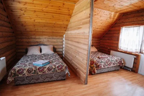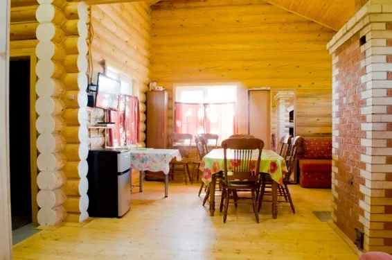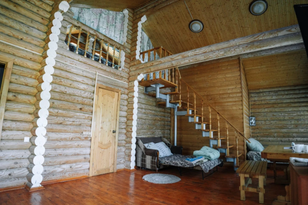 VIP-Коттедж двухэтажный, рубленный 2-4-6-ти местный с русской баней и беседкой на берегу озераНа первом этаже просторная гостиная, мини-кухня (электроплитка, СВЧ, ХЛ, ТВ, необходимый набор посуды), двуспальная кровать, двуспальный диван, русская баня с выходом на озеро (топится по желанию гостей, одна топка раз в 2 дня включена в стоимость).
