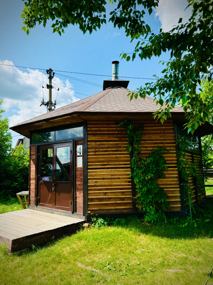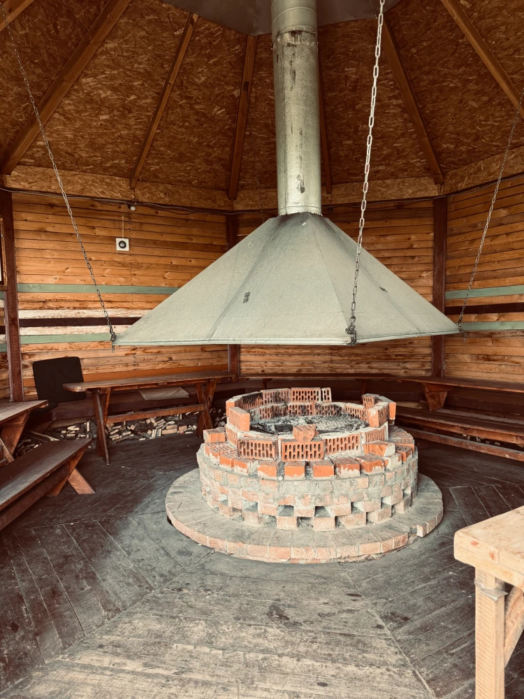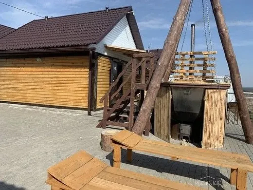 Возле каждой бани стоит горячий чан, с зоной барбекю.