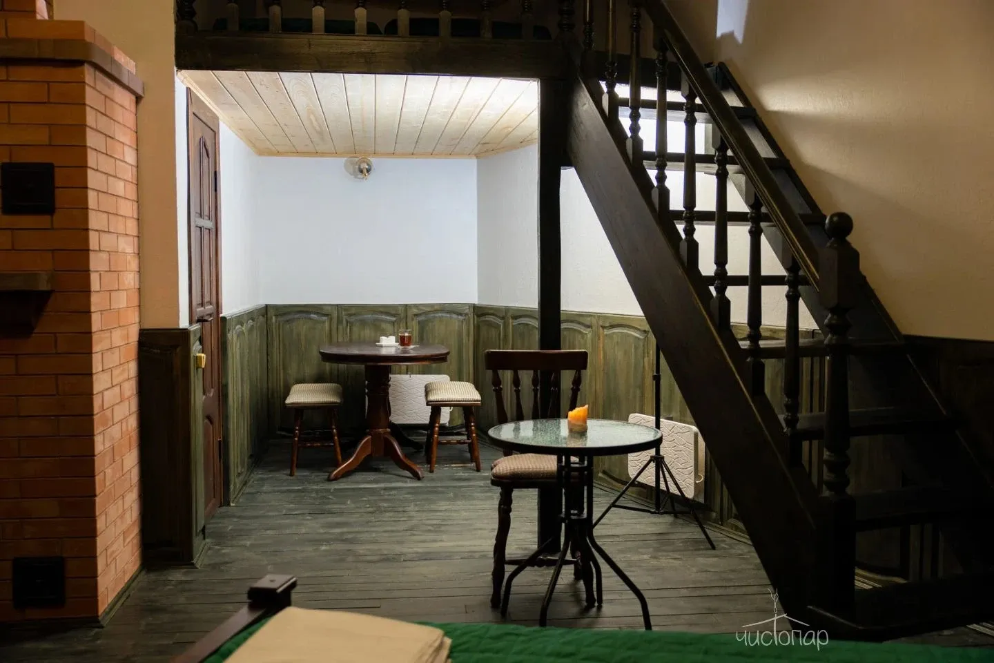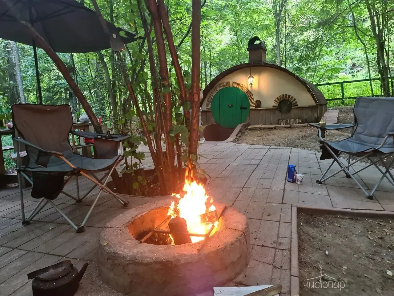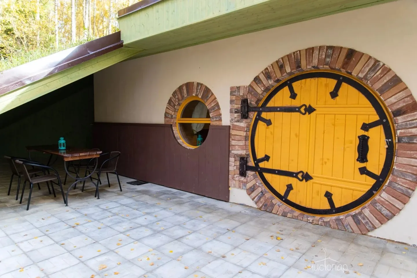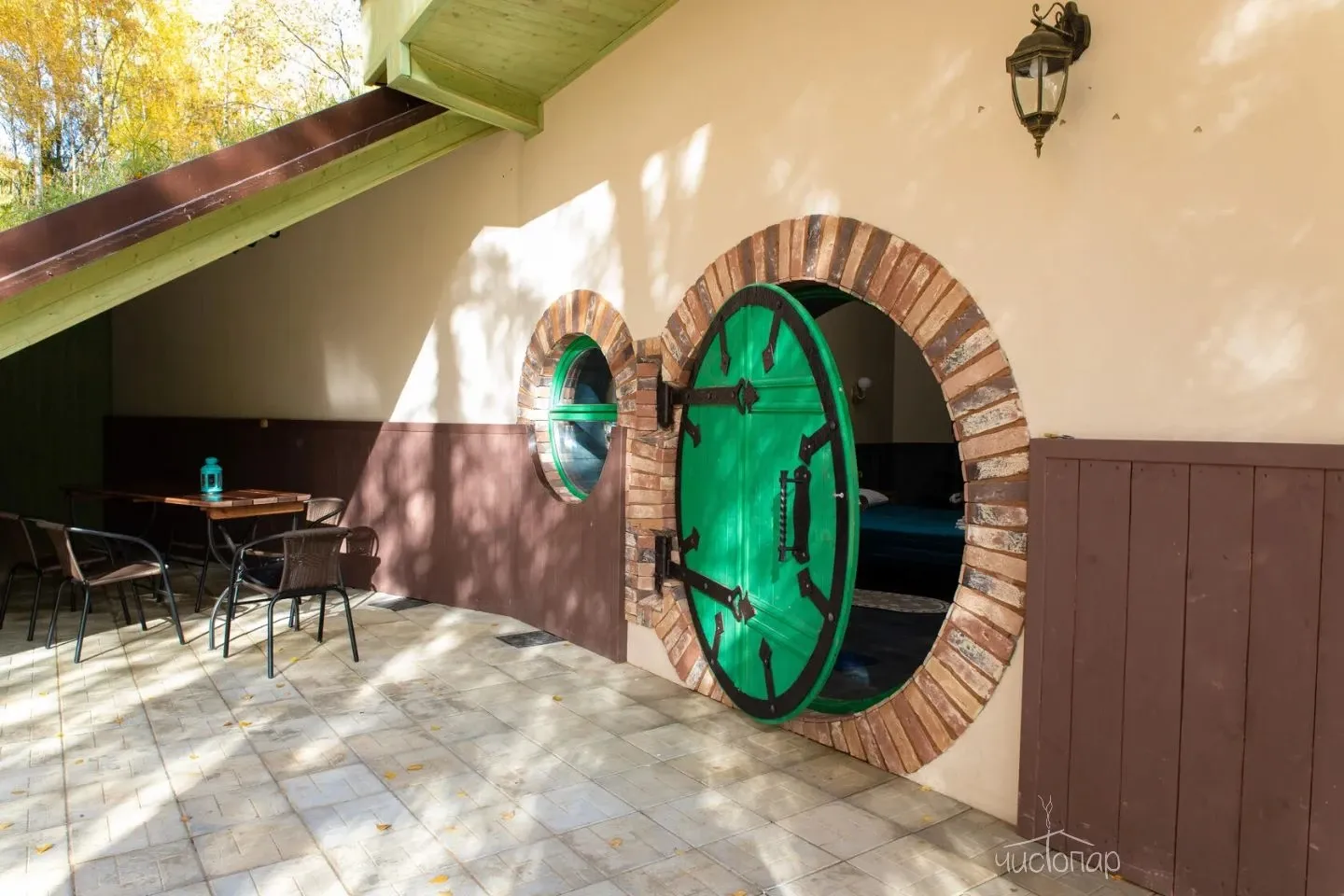 HobbHotel - по хоббитским меркам это большое сооружение, у которого целых 7 хозяев хоббитов. Все они дружно и кропотливо работали над строительством своих жилищ, которые выстроены по всем канонам хоббитской архитектуры. Каждая нора имеет свою печь, отдельный вход, уютную обеденную зону и террасу. На крыше здания растёт разнотравье, а вокруг орешник и ольха. На открытой веранде есть место под крышей, где можно укрыться от дождя за чашечкой чая.
