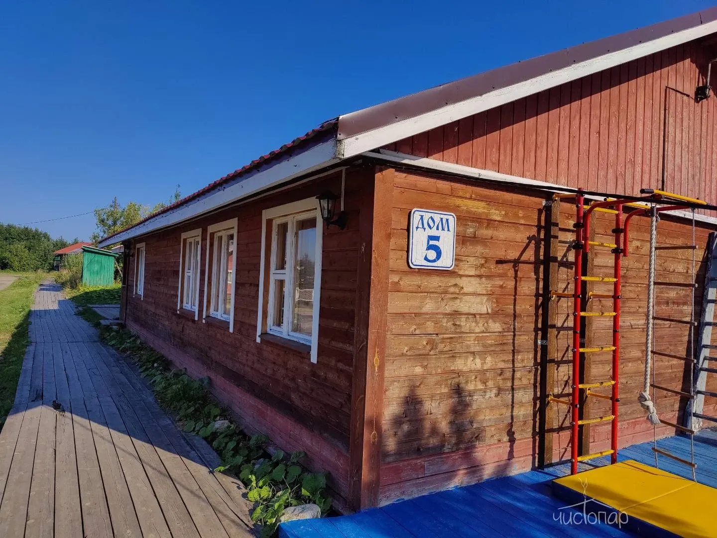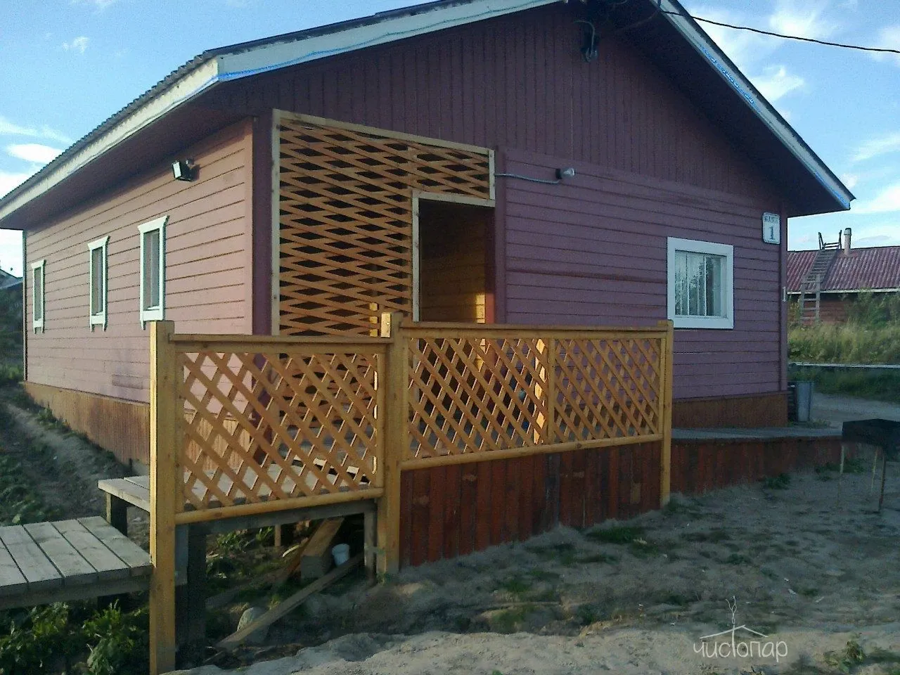 Дом №6Домик #6 может уместить до 15 человек за стол и 8 человек на ночь (четыре отдельные спальни с большими кроватями). Имеет кухонный уголок и большую беседку с электричеством. В стоимость входят мангал, шампура, чайник, питьевая вода, микроволновая печь и телевизор.
