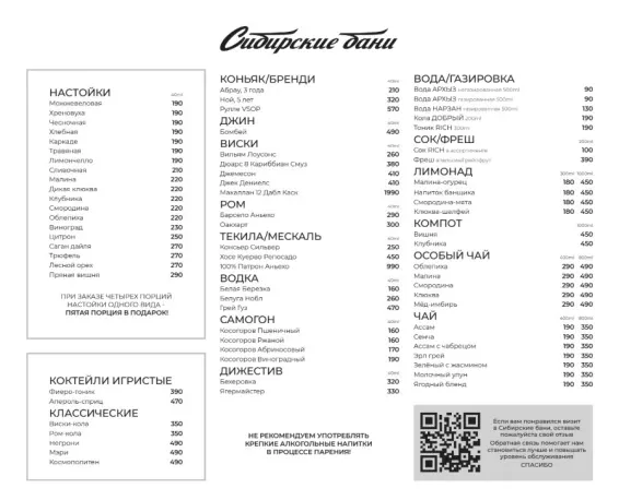 В «Сибирских банях» гостей ждёт 3 банных разряда: мужской, женский и семейный. А также ресторан русской кухни и спа-комплекс (спа ритуалы, бьюти процедуры, ногтевой сервис, барбершоп, солярий и многое другое). Бани работают по концепции общественных в формате живой очереди.