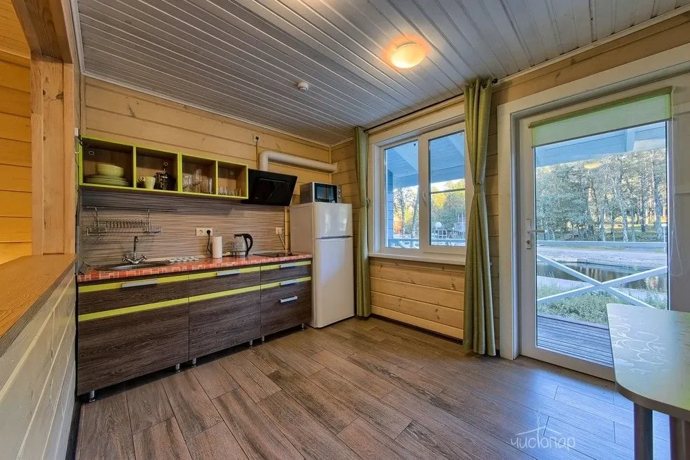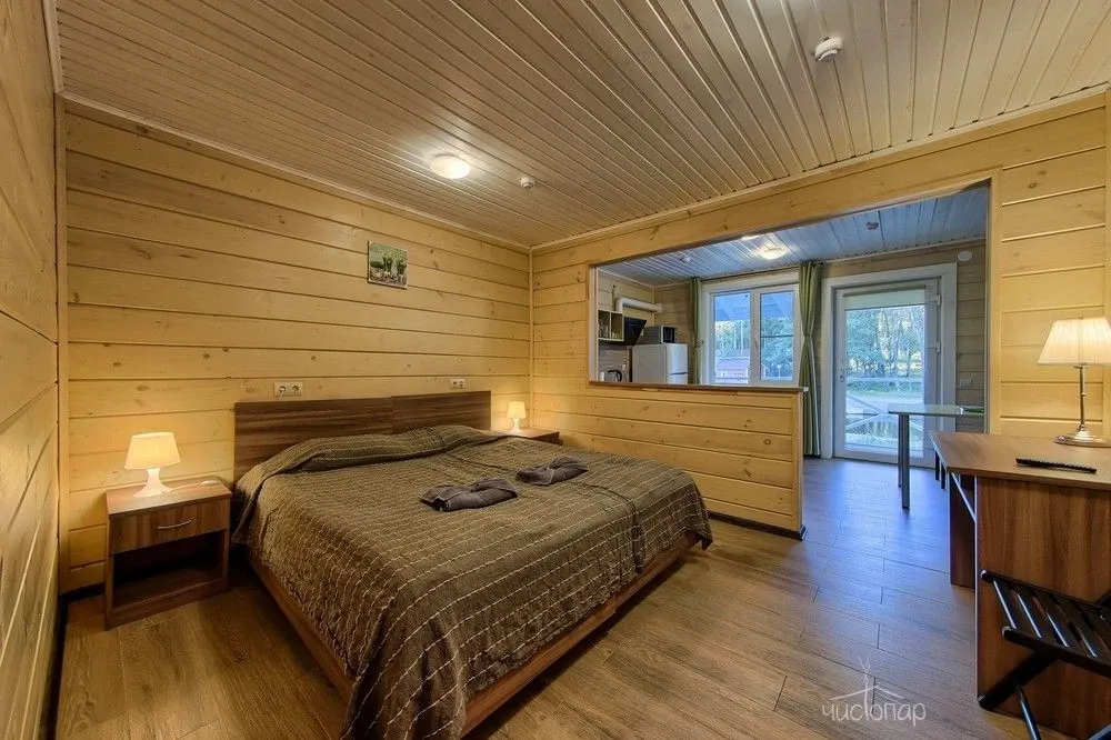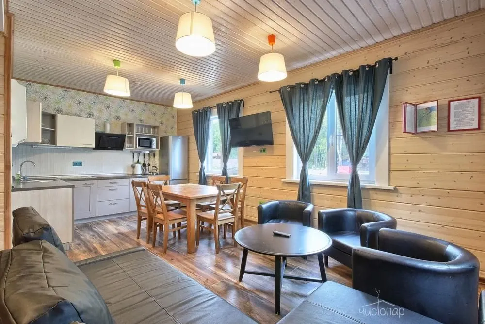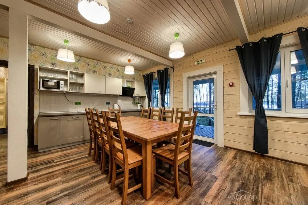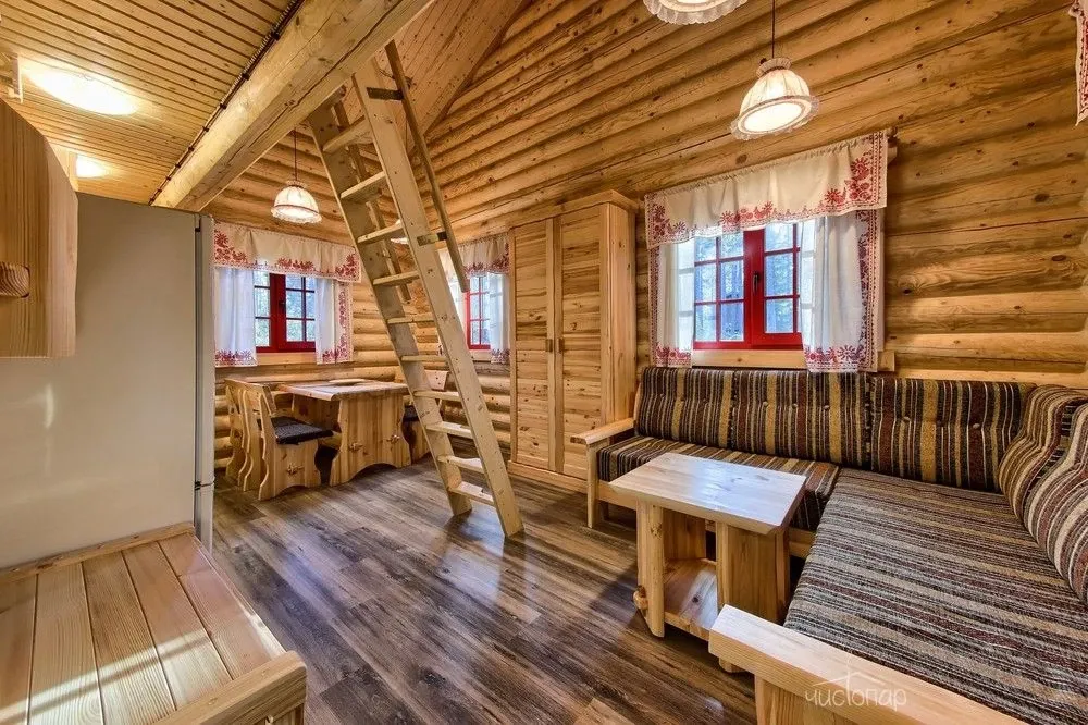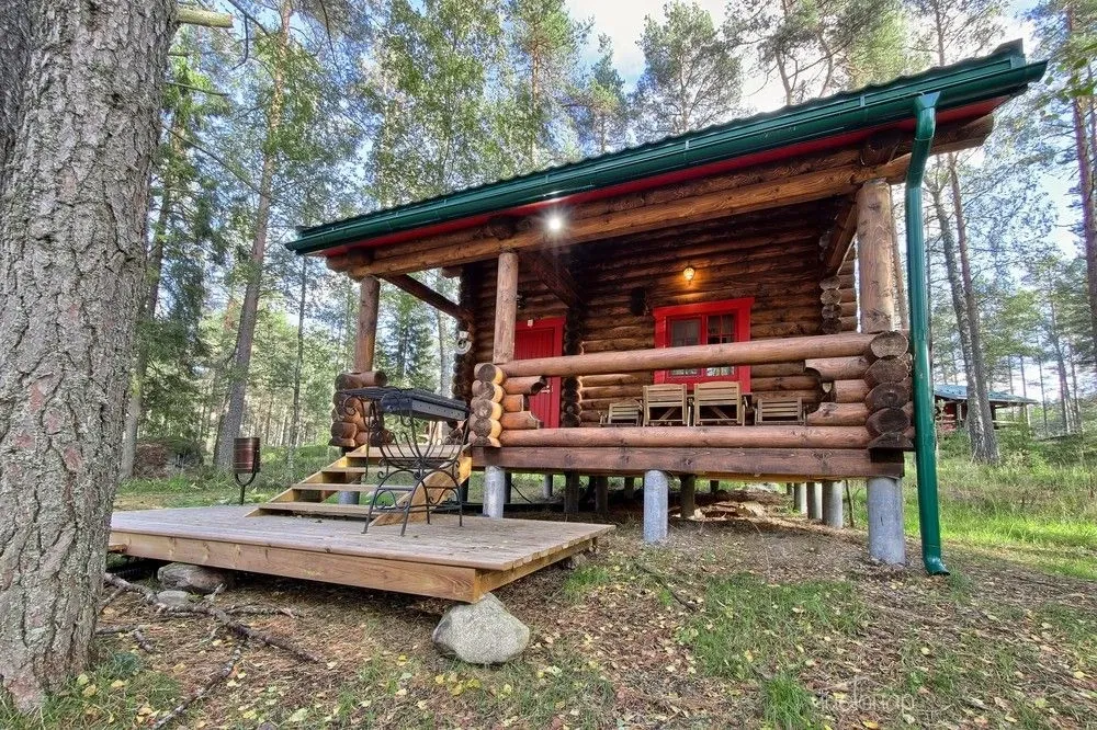 Коттеджи с дровяными саунами на 6 и на 12 человек, коттеджи для 4 в карельском стиле, а также номера для двоих с видом на Ладогу.