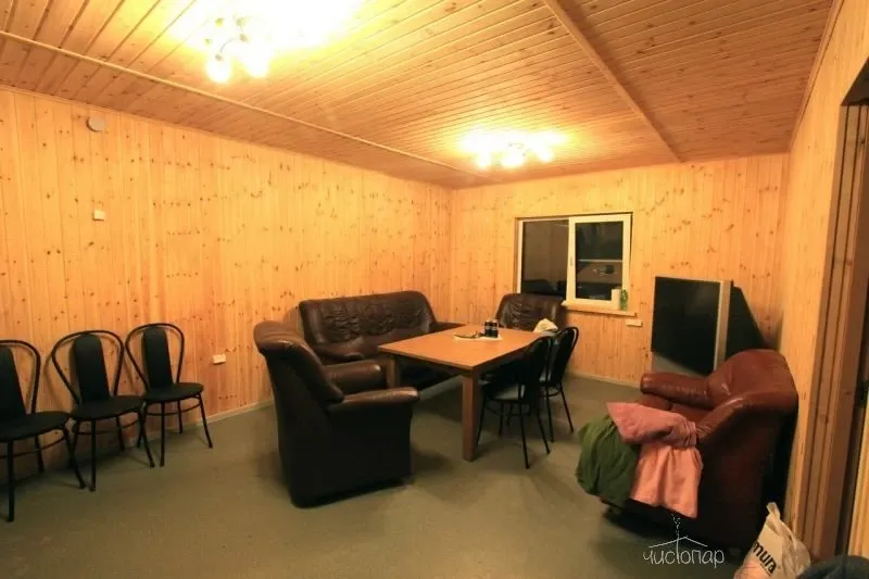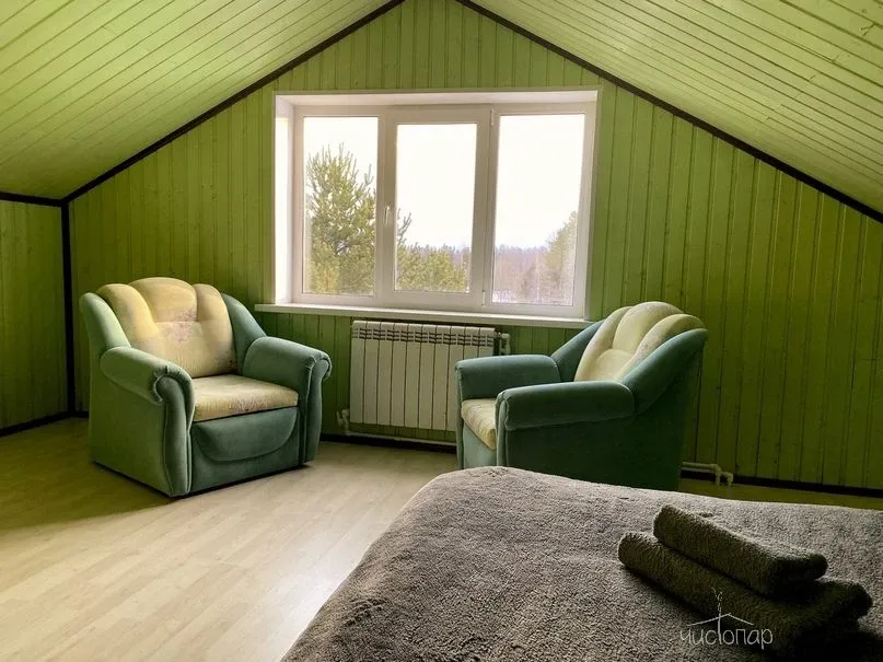 К услугам гостей - удобные кресла и кофейный столик, установленные у окна с видом на поле и лес.