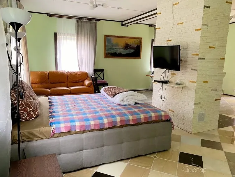 Отдельный просторный номер площадью 32 кв.м. расположен на втором этаже главного здания. В комнате с очень широкой двуспальной кроватью имеется собственный душ и туалет, а также телевизор с плоским экраном.