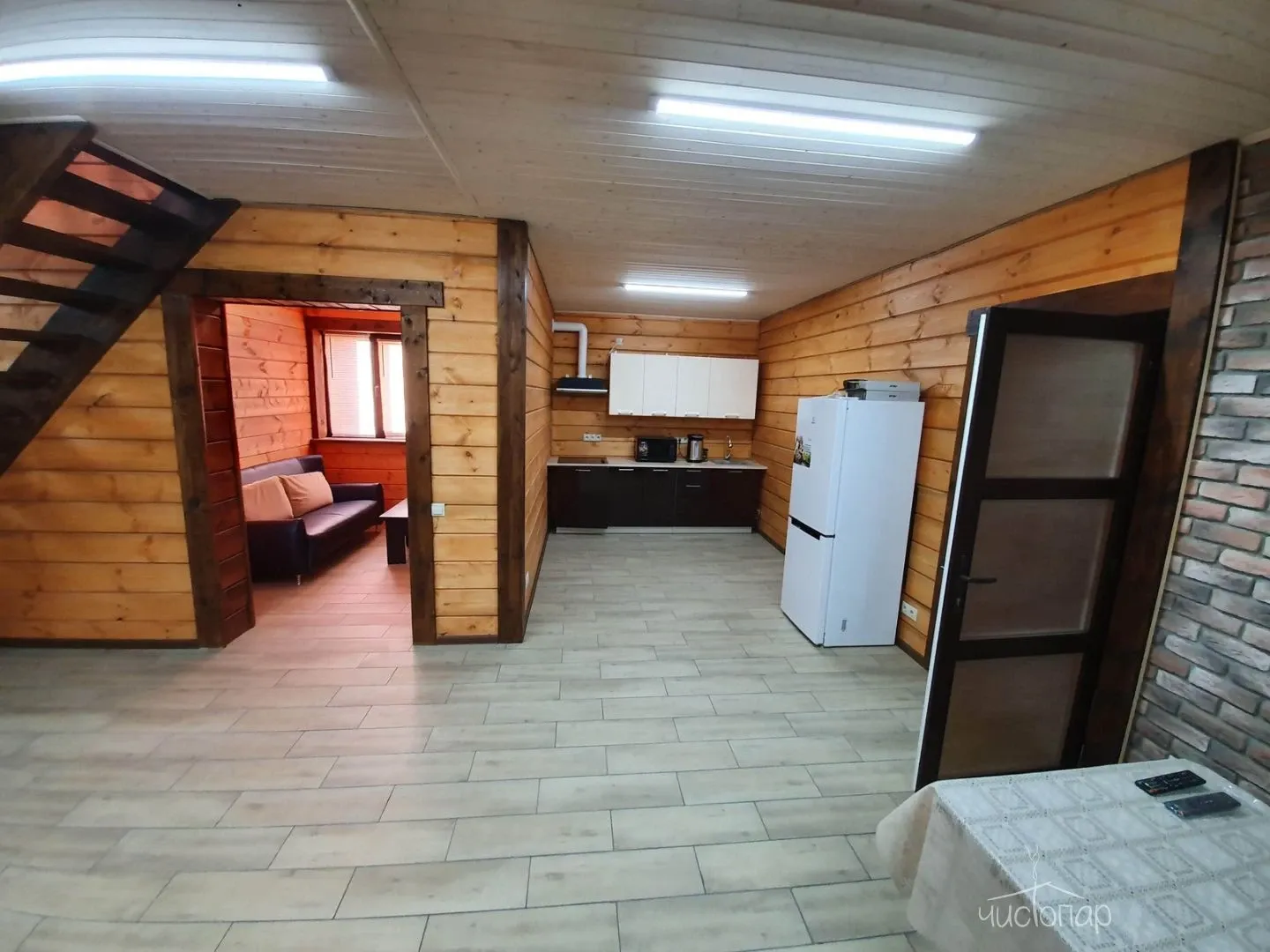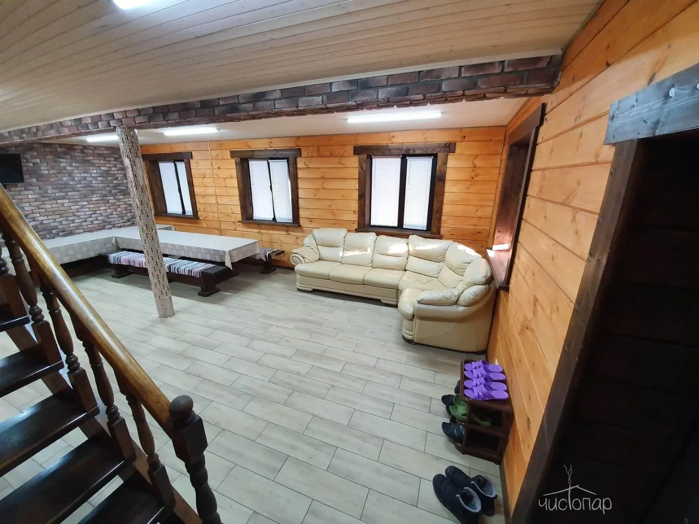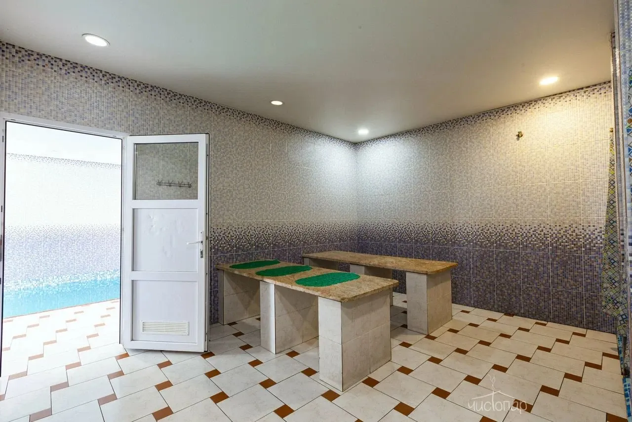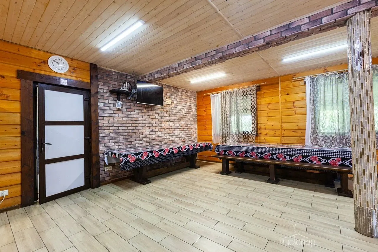 Традиционная русская баня на дровах. Также имеется бассейн, где можно охладиться после захода в парилку с современным водоочистительным оборудованием. В комнате отдыха создан уютный, практичный интерьер из преимущественно натуральных, экологичных материалов. Комплекс не располагает собственной кухней, можно приносить еду с собой и совместить баню с небольшим застольем.