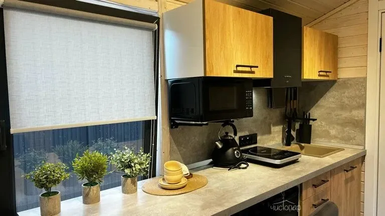 На 2 персоны. Двуспальная кровать, своя кухня и дворик с мангалом, Wi-Fi, умный дом с Алисой.