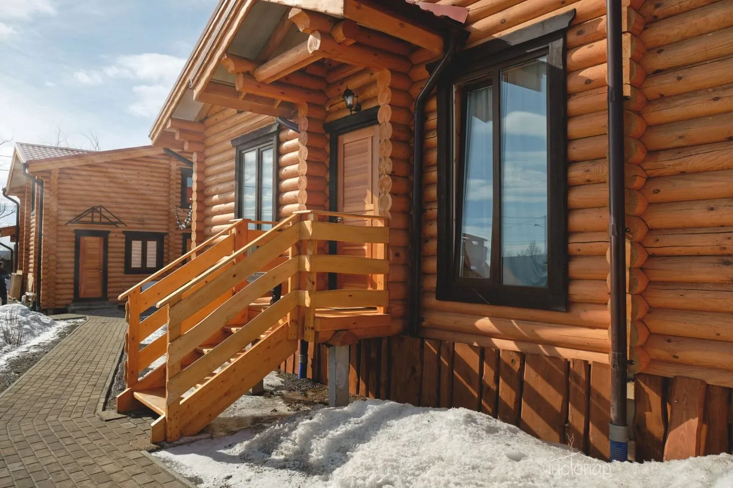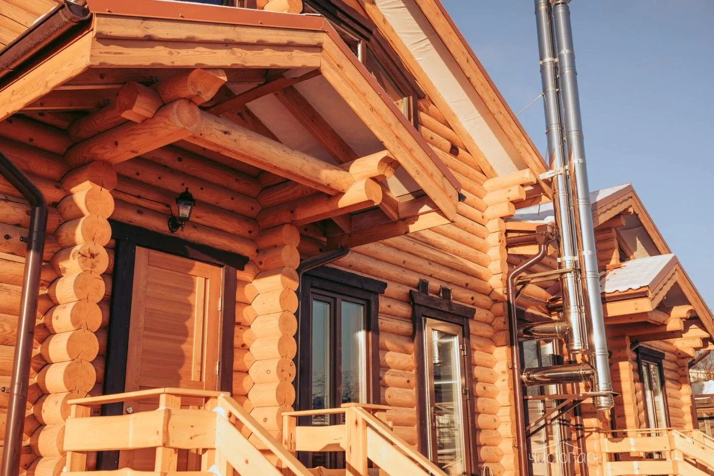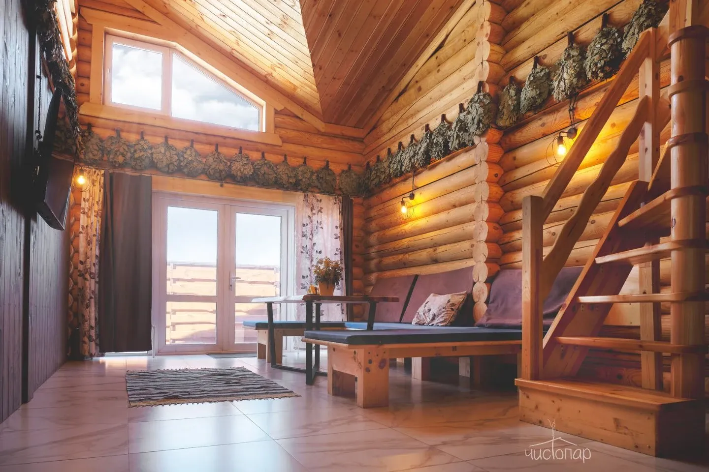 Бани и кафе выполнены в стиле современной русской деревни. Архитектурный ансамбль из деревянного сруба прекрасно дополняют изысканные детали интерьера.