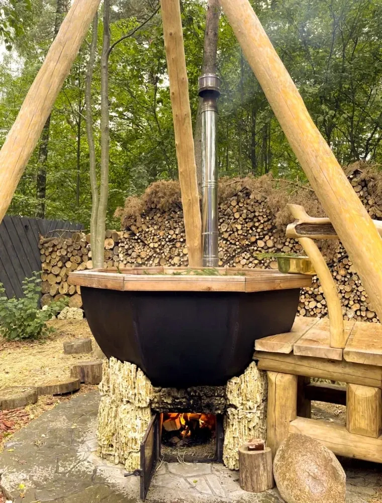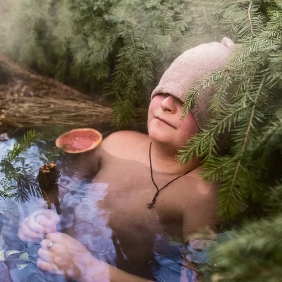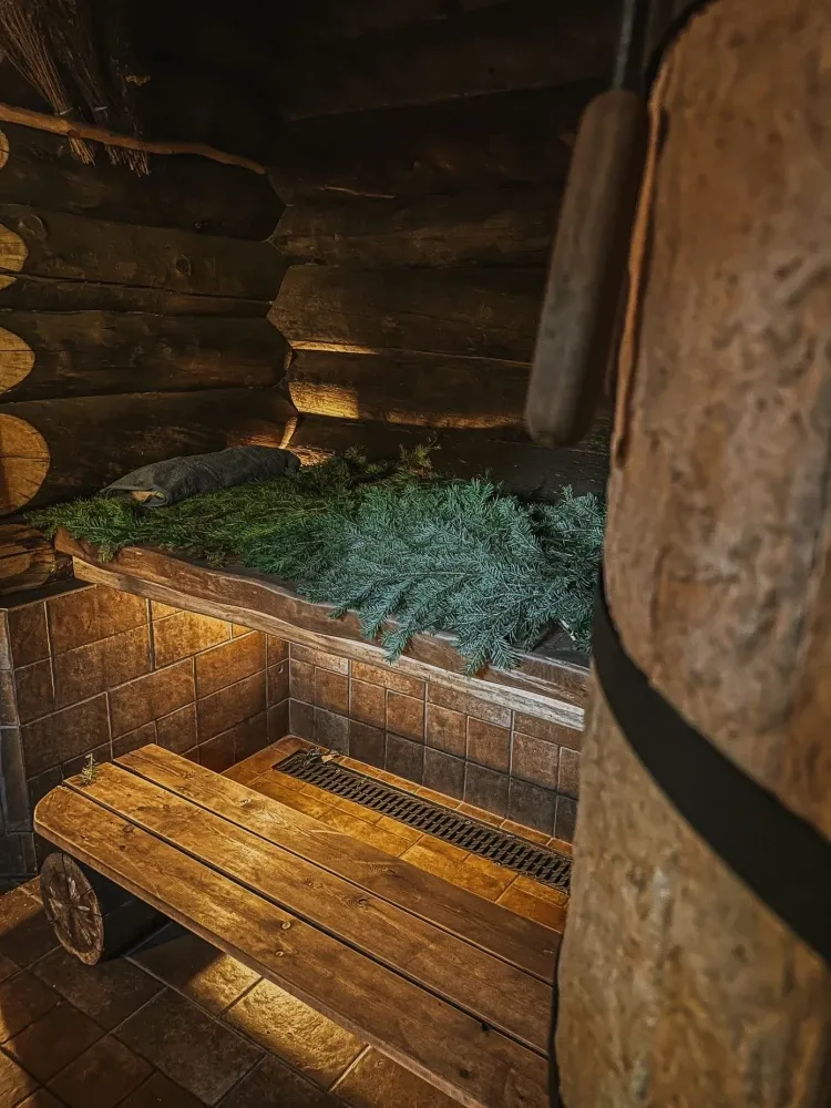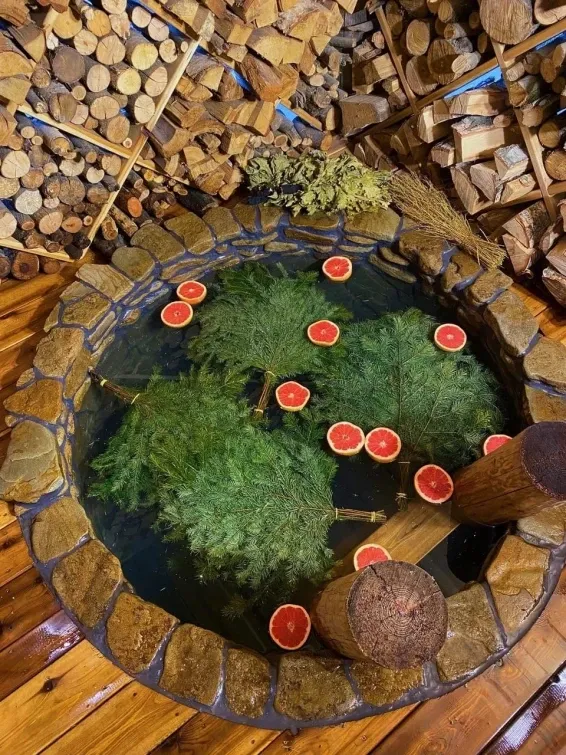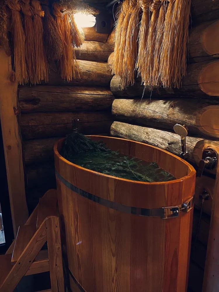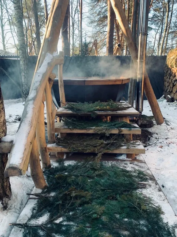 ▪ Второй, самый интенсивный заход. Прогрев дубовыми вениками. Ныряние в холодную купель. Догрев вениками в парной. Уличный горячий чан на огне и отдых на лежачих качелях. Ароматный морс.