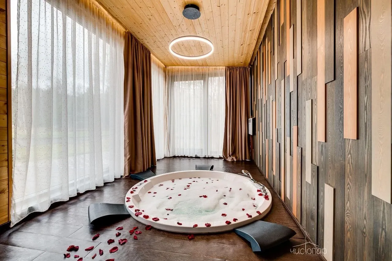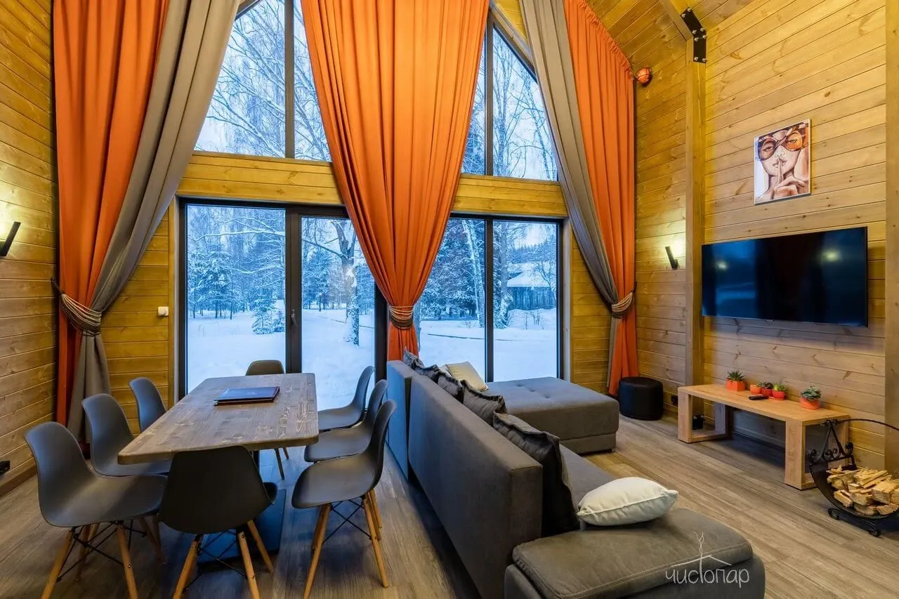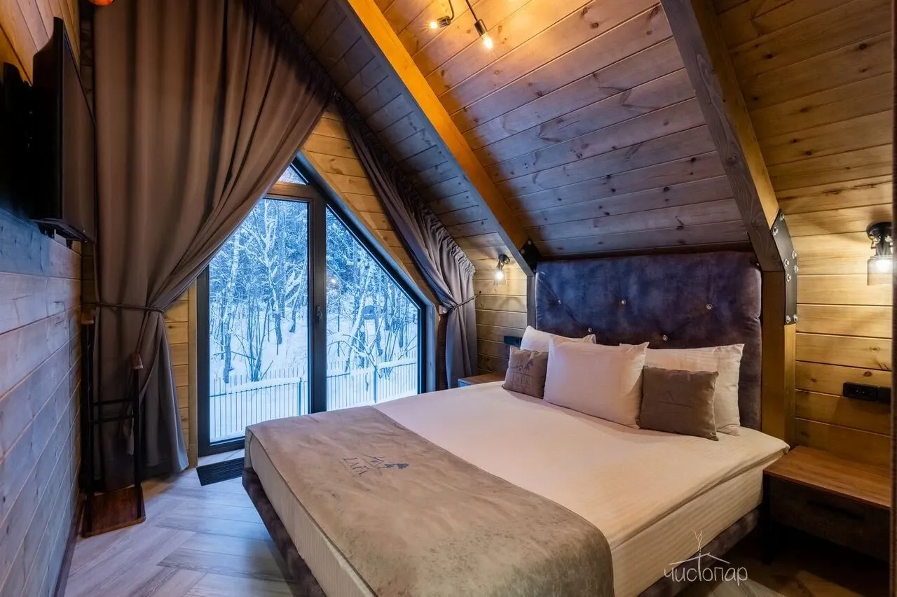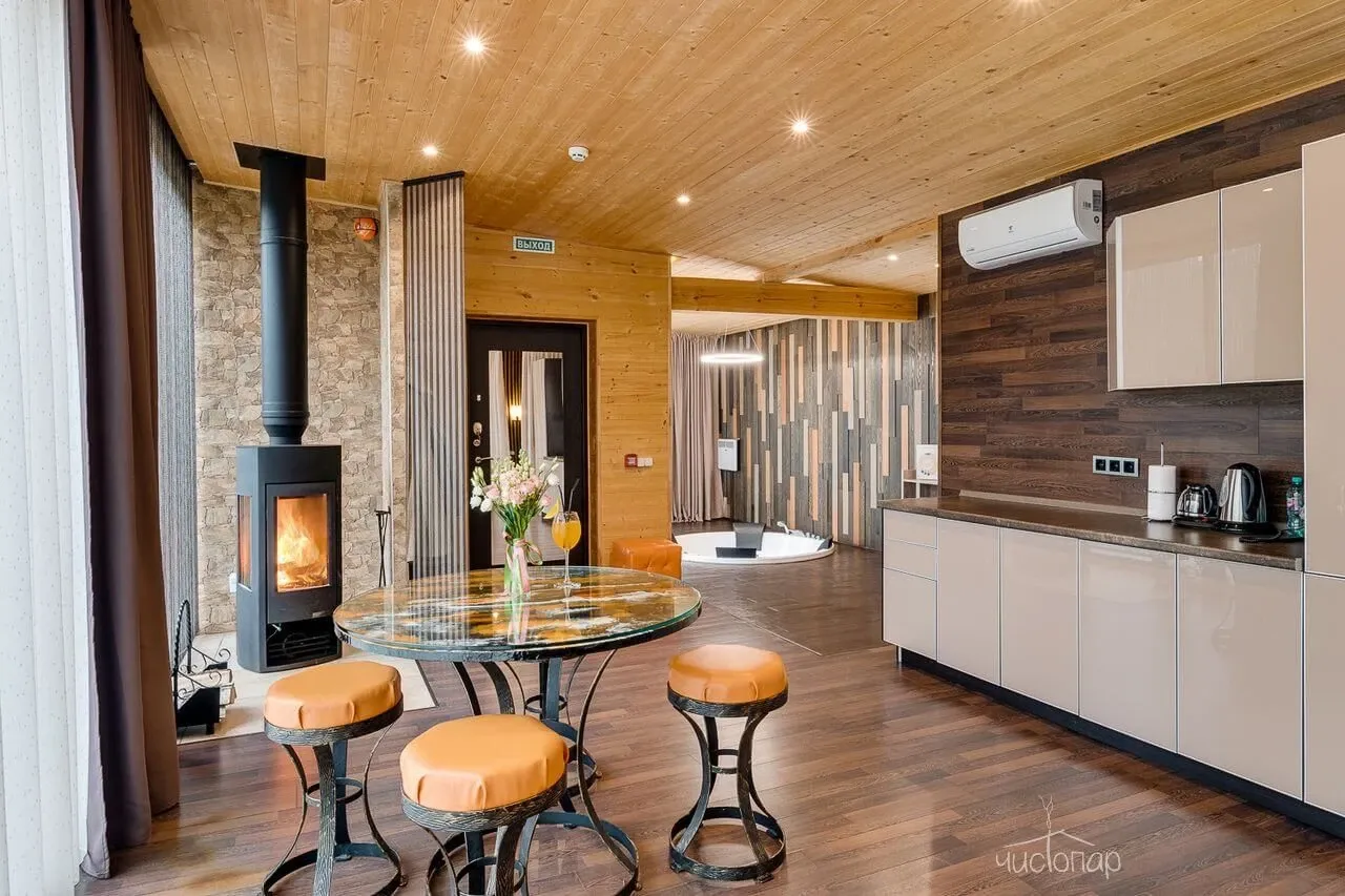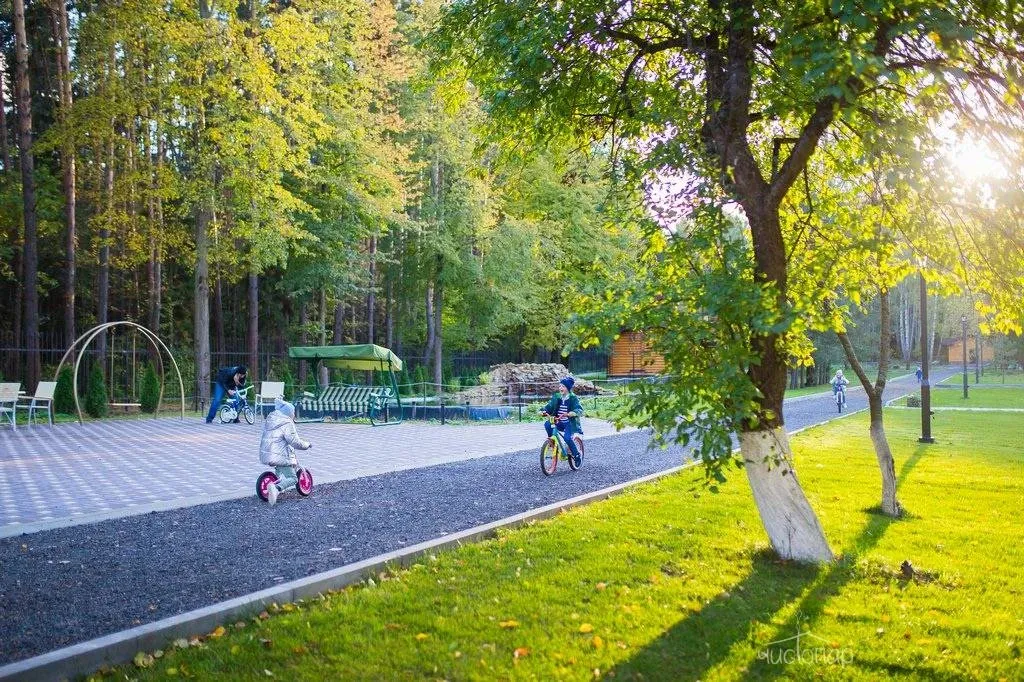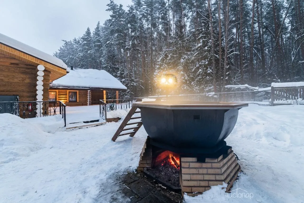 Уютные шале, в каждом из которых есть настоящий камин на дровах, сауна, уличные купели. Можно заказать еду из ресторанного меню. Летом можно прогуляться по саду, покататься на велосипедах или позагорать на шезлонгах, зимой — попариться в бане, посидеть в теплом чане с ароматными травами, покататься на санках или побродить по заснеженному лесу.