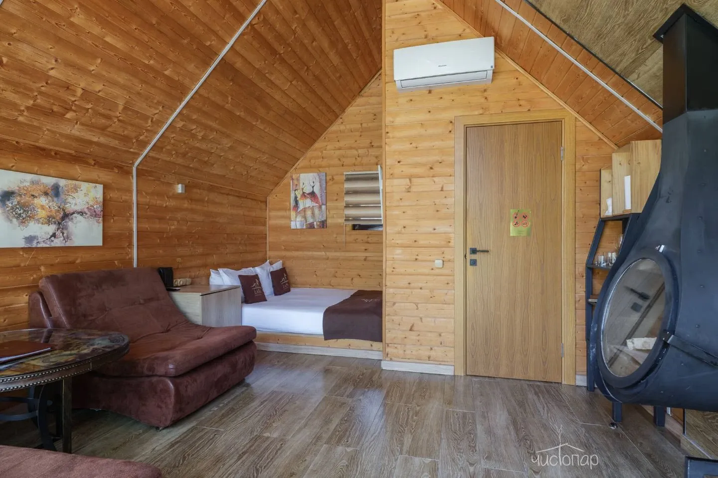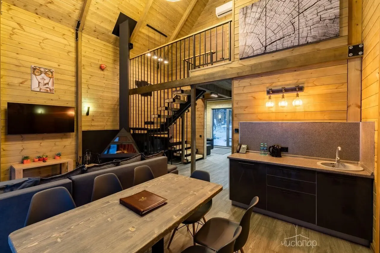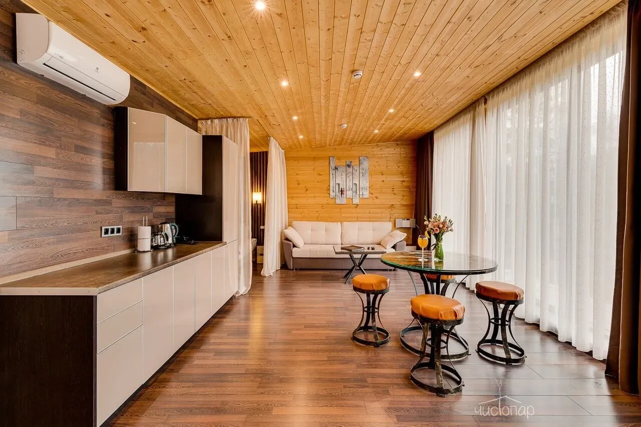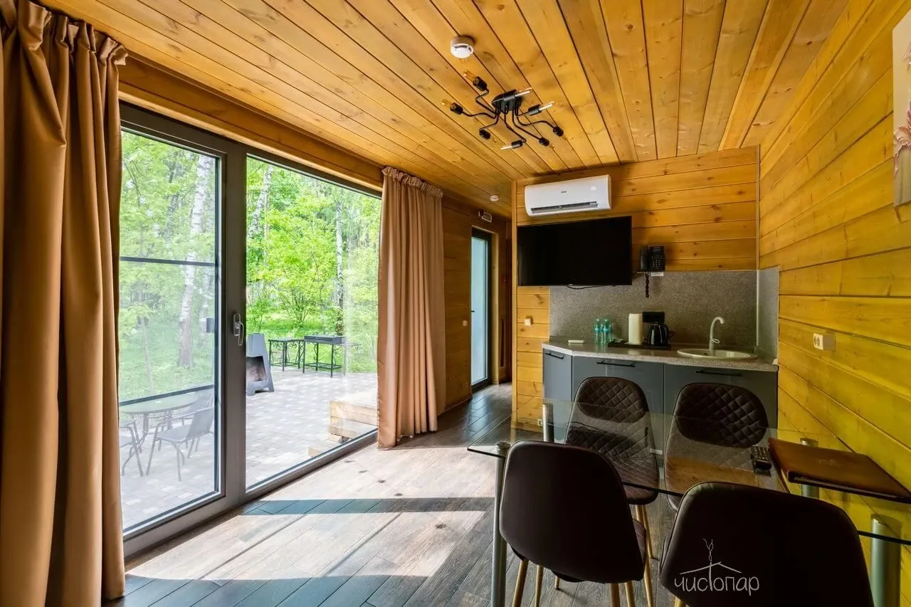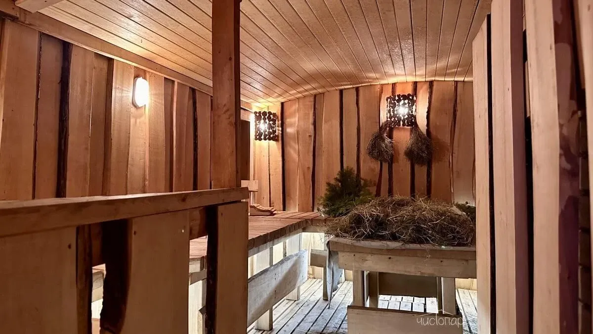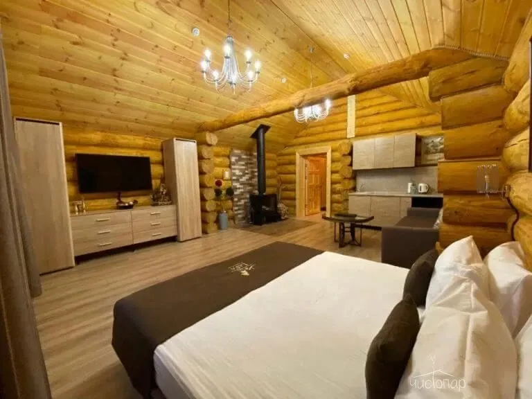 Уютные шале, в каждом из которых есть настоящий камин на дровах, сауна, уличные купели. Можно заказать еду из ресторанного меню. Летом можно прогуляться по саду, покататься на велосипедах или позагорать на шезлонгах, зимой — попариться в бане, посидеть в теплом чане с ароматными травами, покататься на санках или побродить по заснеженному лесу.
