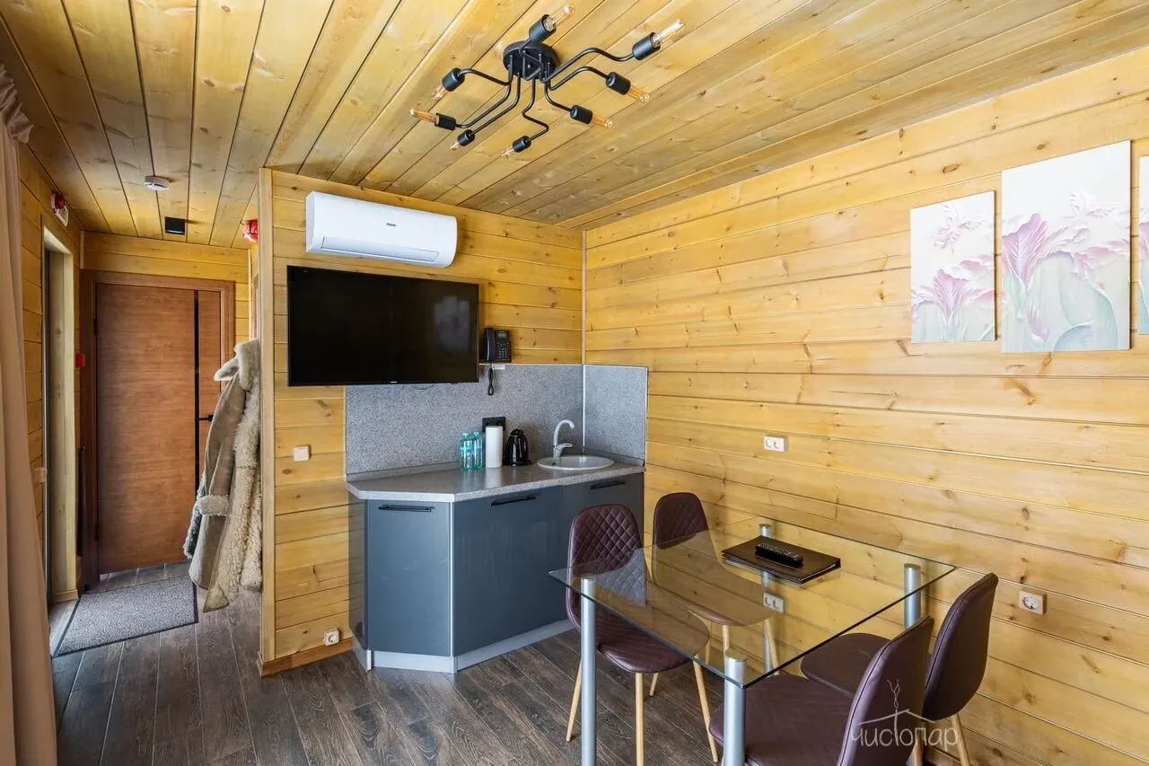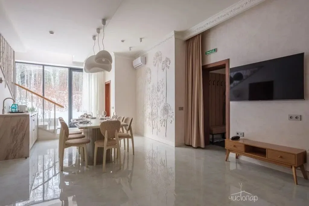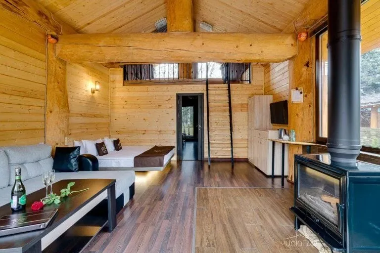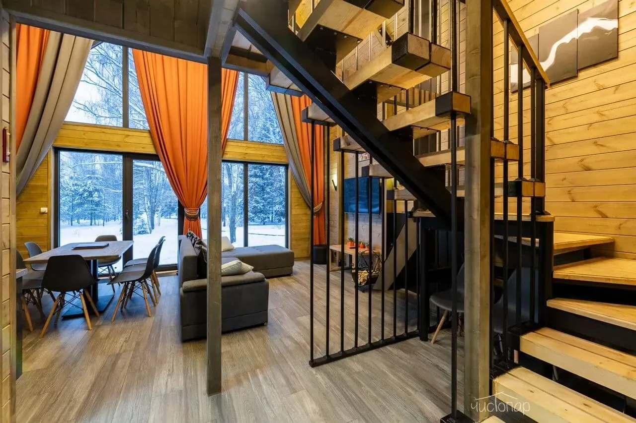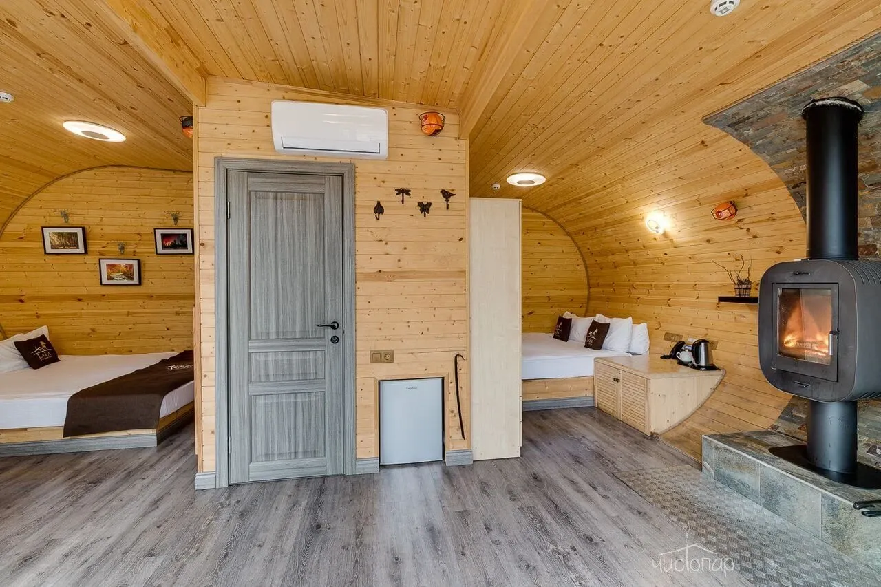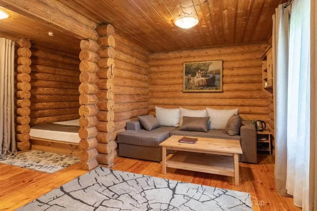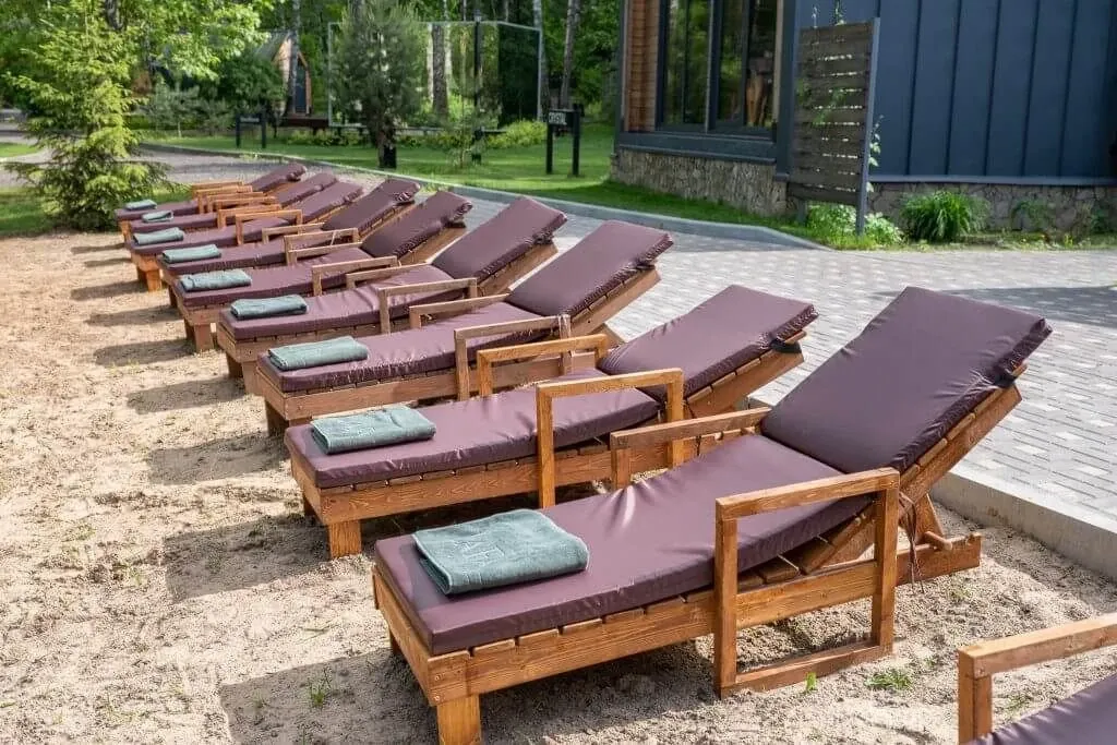 Уютные шале, в каждом из которых есть настоящий камин на дровах, сауна, уличные купели. Можно заказать еду из ресторанного меню. Летом можно прогуляться по саду, покататься на велосипедах или позагорать на шезлонгах, зимой — попариться в бане, посидеть в теплом чане с ароматными травами, покататься на санках или побродить по заснеженному лесу.