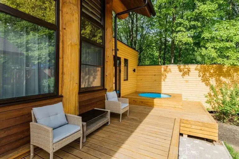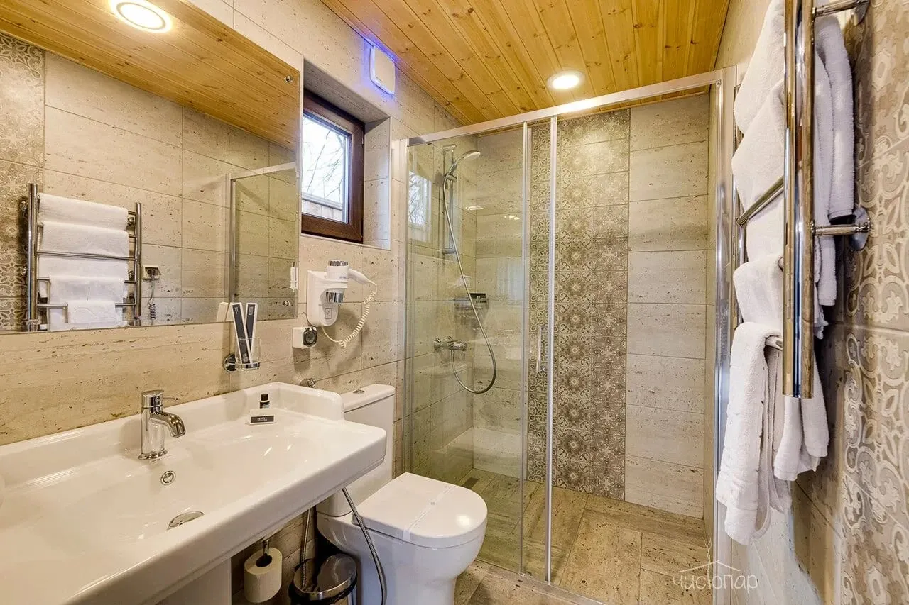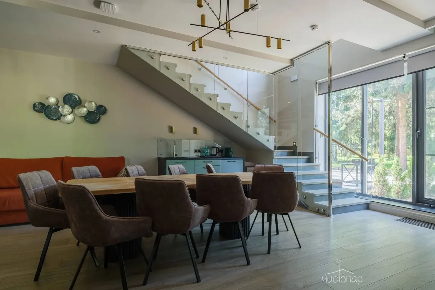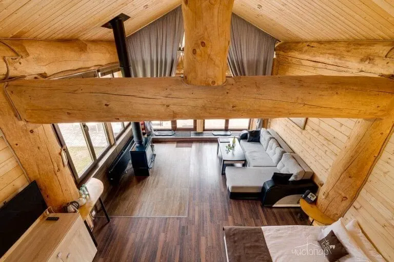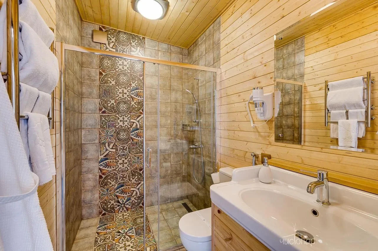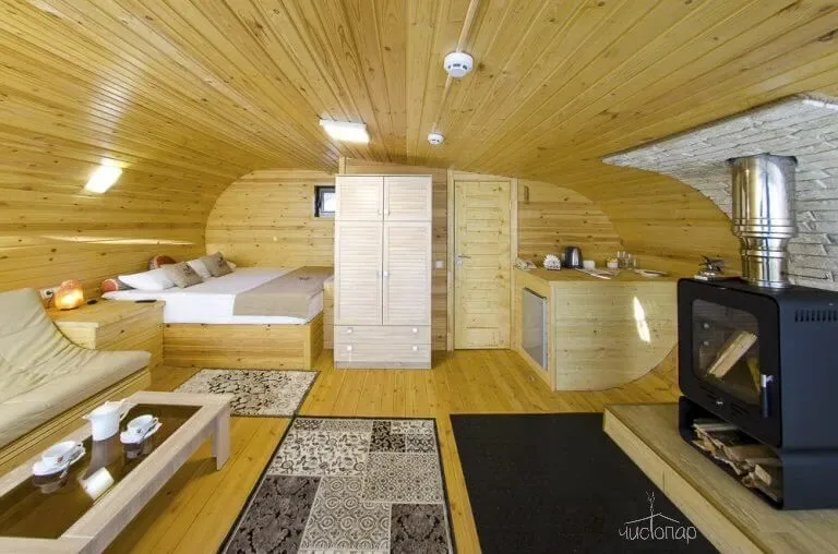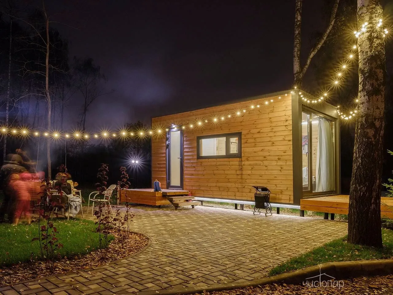 Уютные шале, в каждом из которых есть настоящий камин на дровах, сауна, уличные купели. Можно заказать еду из ресторанного меню. Летом можно прогуляться по саду, покататься на велосипедах или позагорать на шезлонгах, зимой — попариться в бане, посидеть в теплом чане с ароматными травами, покататься на санках или побродить по заснеженному лесу.