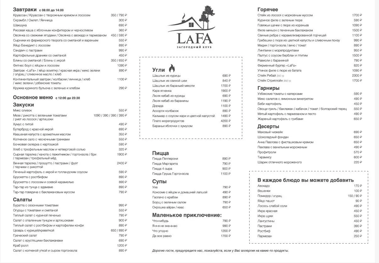 «LaFa» — уютный загородный клуб в 25 минутах от Москвы по направлению к городу Домодедово. В лесном массиве располагаются две уютные добротные бани на дровах, построенные из крупного дикого сруба и огромный чан, подогреваемый костром. К услугам гостей профессиональный банщик.