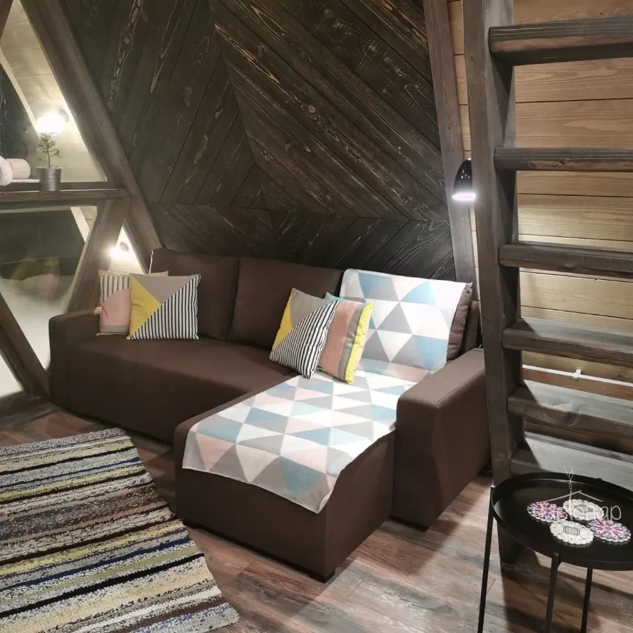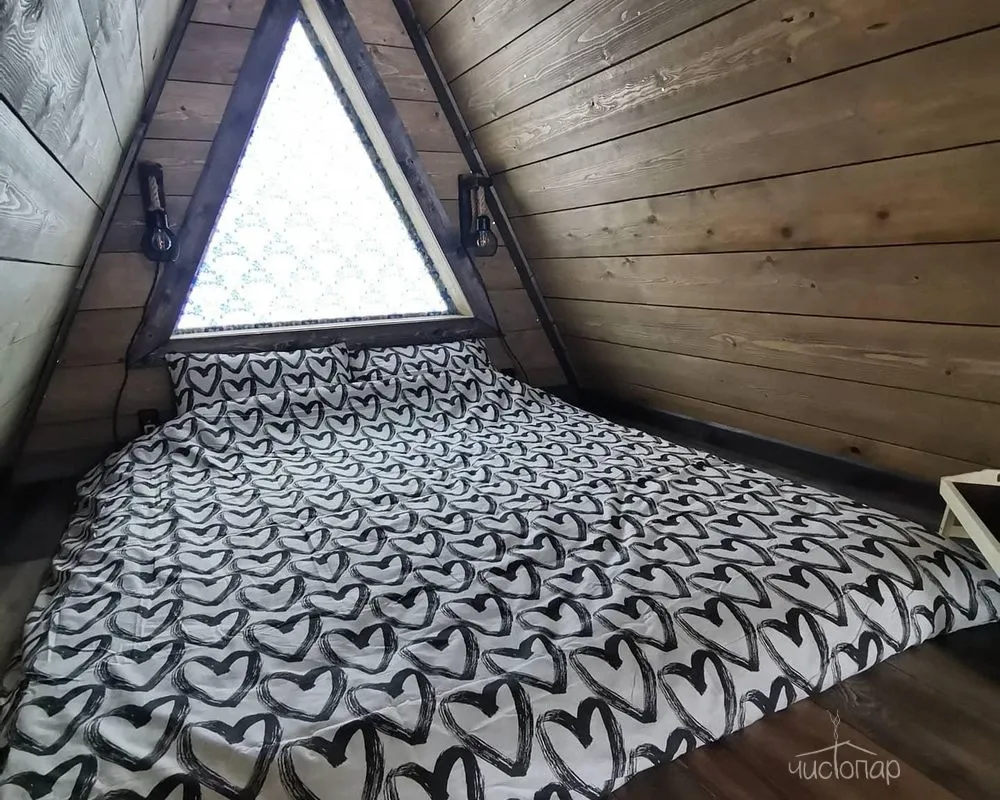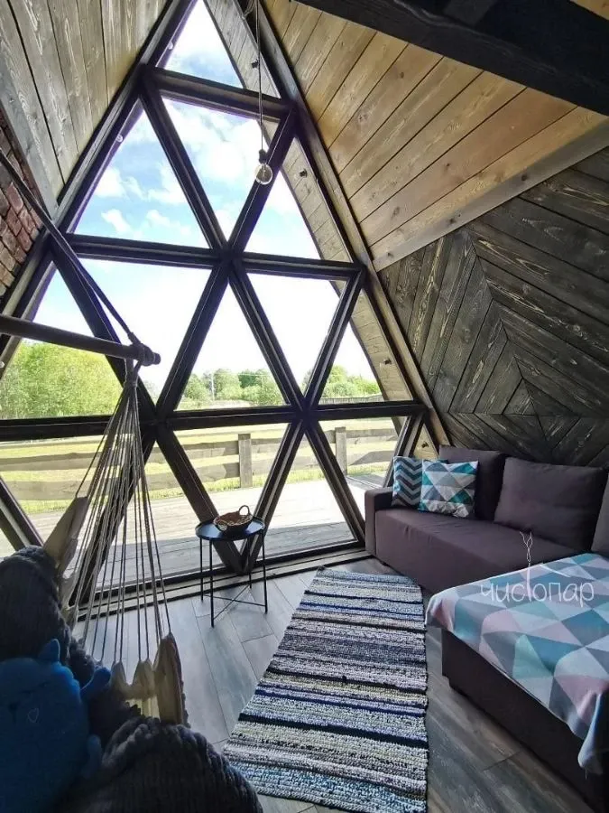 Треугольный домик со стеклянным фасадом со всеми удобствами рассчитан мах на 4-х человек (2 полноценных 2-х спальных места)