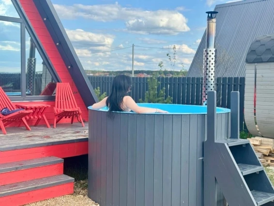 Купель на дровахУ каждого домика есть на террасе банный чан под открытым небом. Купание в купели помогает забыть о стрессах, снять напряжение и расслабиться душой и телом.