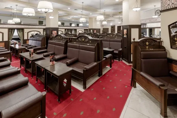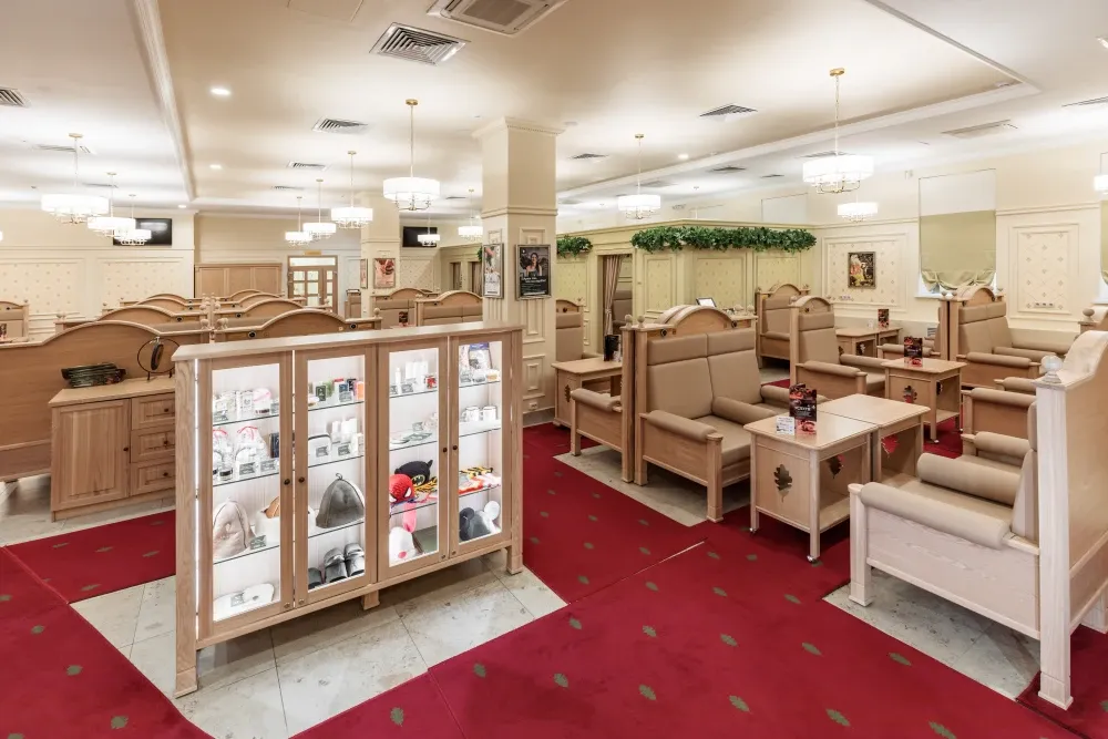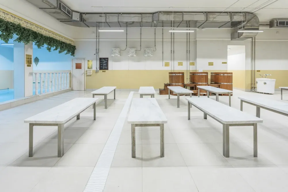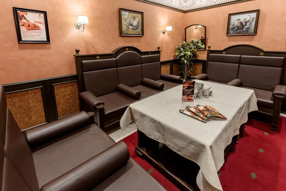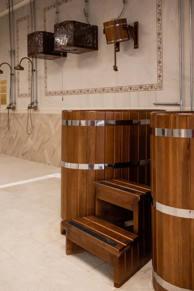 К услугам гостей — три мужских и один женский разряд, каждый уникален. Мыльные отделения оборудованы всем для комфортного отдыха: зоны для бритья, бассейны с комфортной температурой, три ледяные купели, обливные устройства и ведра.