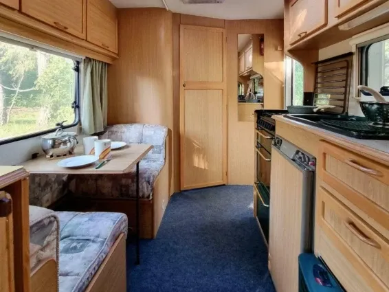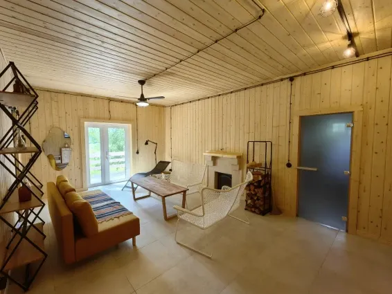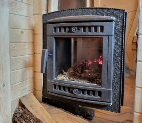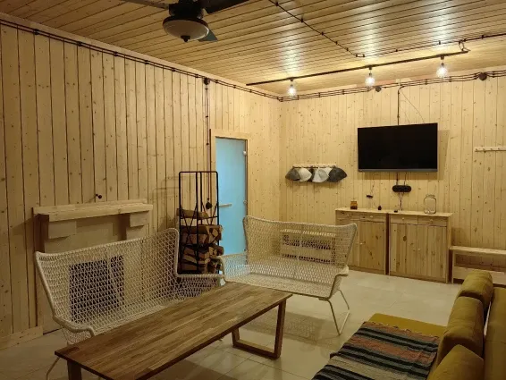 Глэмпинг оборудован небольшим холодильником с морозильной камерой, микроволновой печью, электрическим чайником, двуспальной кроватью и раскладным 1,5 спальным диваном, cмарт-телевизором, мобильной сплит-системой.