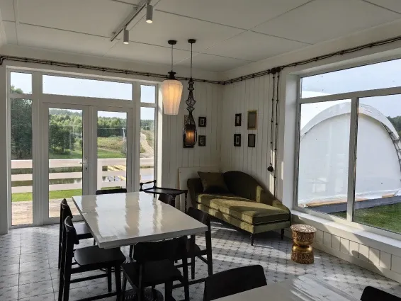 В аренду глэмпинга и автодома входит проживание в них, пользование детской площадкой, мангалом и костровищем, а также пользование общественными зонами: пляжем с лежаками, библиотекой с книгами и играми, а также контактным зоопарком.