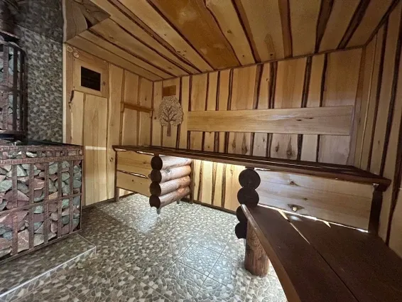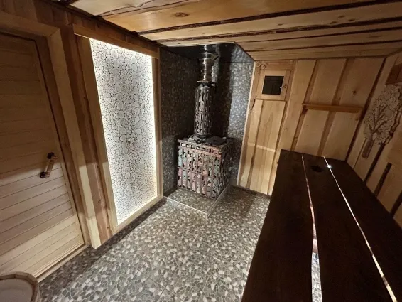 1этаж - комната отдыха, парная (отделана в стиле леший, со стерео-музыкой, подсветкой, можжевеловым панно, "второе дыхание" после капитального ремонта), с/узел, печь более чем на 350кг камня! (Жадеит, яшма.)
