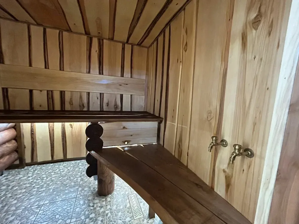 Двухэтажная, отдельно стоящая, с печкой на дровах "арабская ночь", обливной системой "каскад" - открыта к посещению. Холодная купель!
