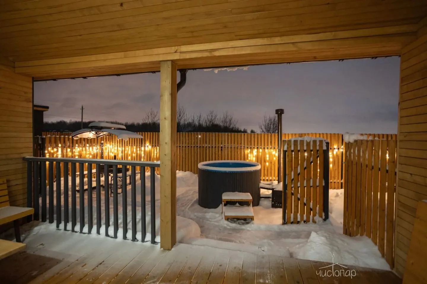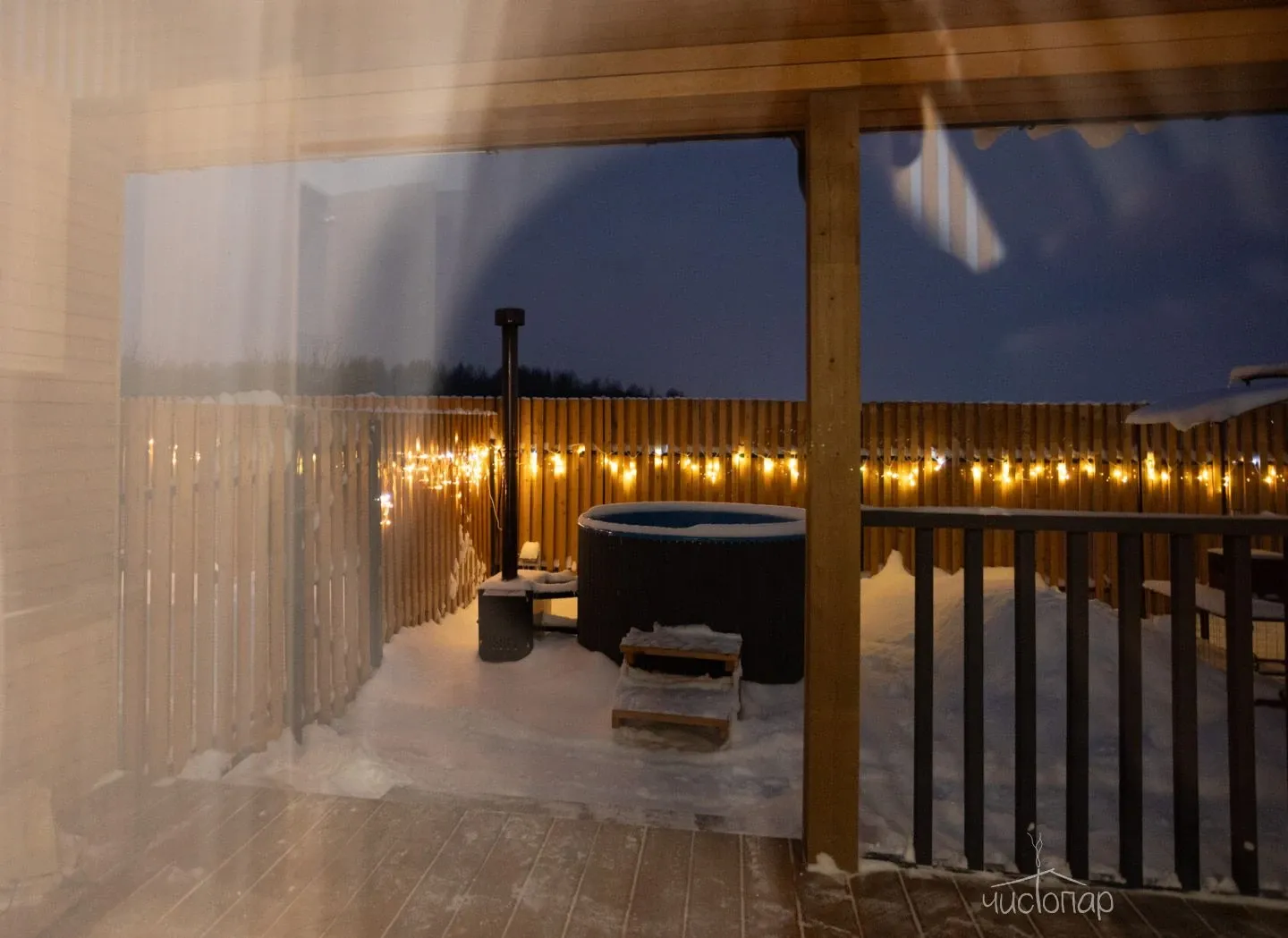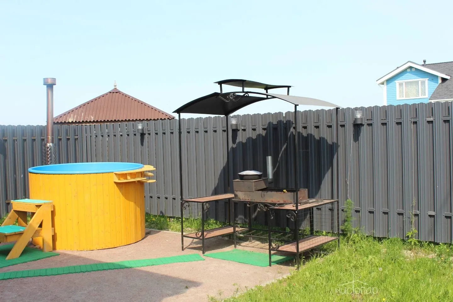 У террасы коттеджа, во дворе – находится купель фурако. Водный релакс под открытым небом в любое время года! (Услуга по приготовлению купели не входит в стоимость аренды коттеджа и оплачивается отдельно)