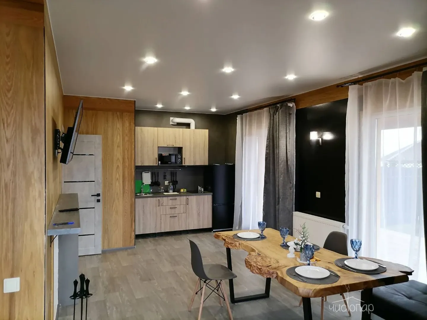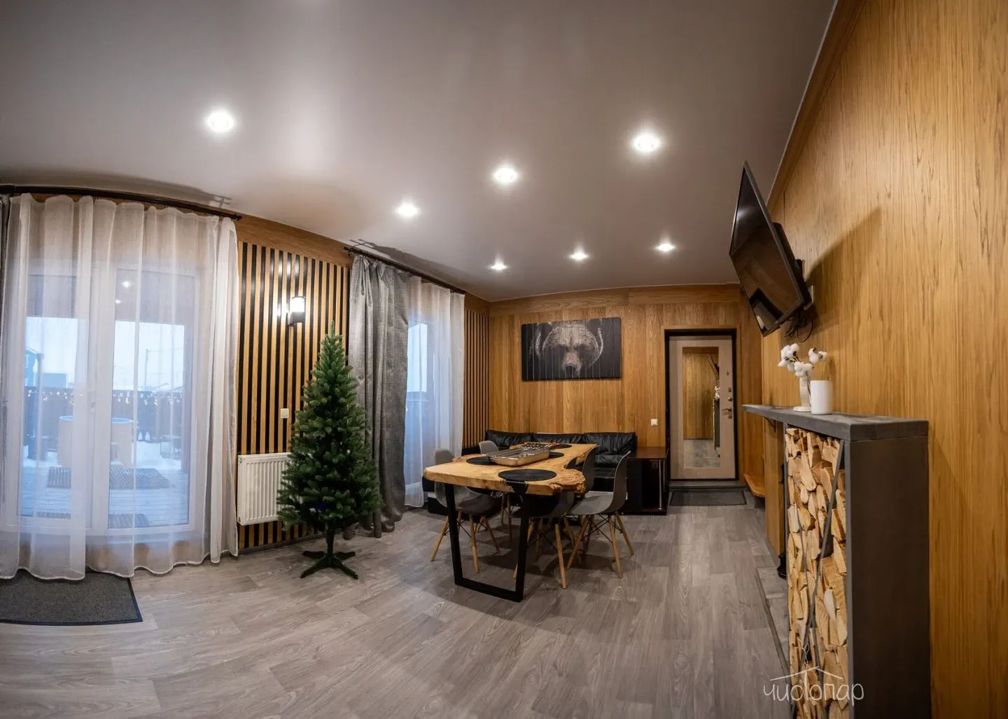 Дизайнерский деревянный стол, панорамные окна, выход на террасу и купель, большой угловой диван (два дополнительных спальных места на диване), телевизор;