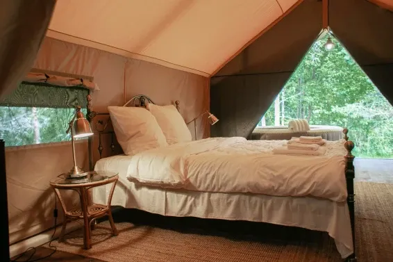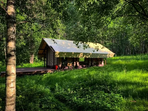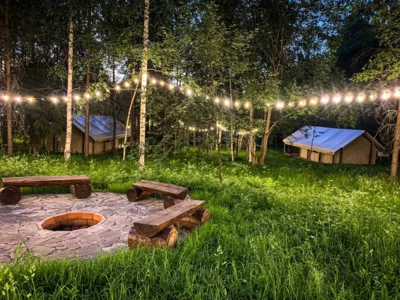 Также можно отправиться к ручью или насладиться рыбалкой на озере, а также посетить места, полные ягод и грибов. Гости могут приготовить свой улов на дровяном гриле в палаточном лагере.