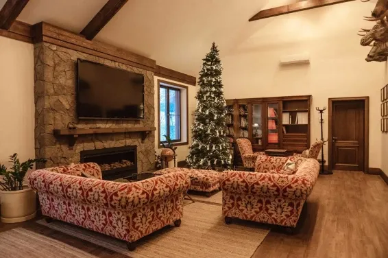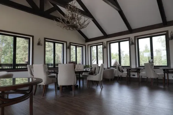 • 2 этаж: банкетный и каминный залы, детская комната — вместимость до 55 гостей.