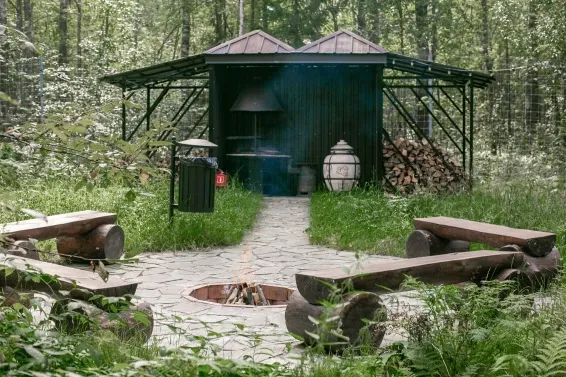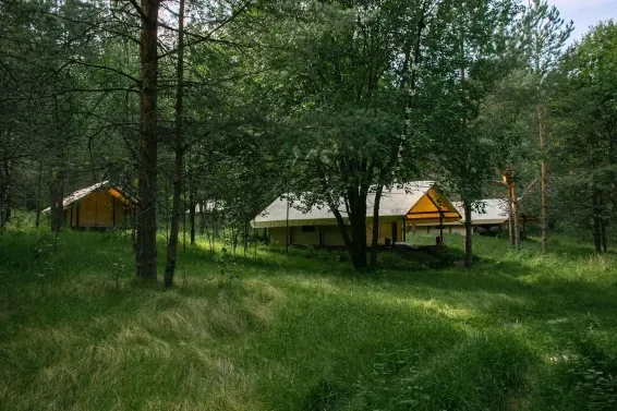 Территория глэмпинга «Ганинская ферма» граничит с живописным лесным массивом, по которому проходит тропа здоровья с указателями.