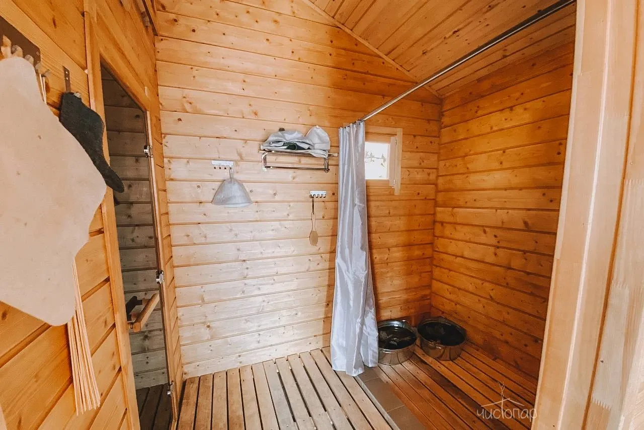 В распоряжении гостей оборудованная всем необходимым русская баня на дровах с подогреваемыми купелями, душевой, беседкой, мангальной зоной, комнатой отдыха.