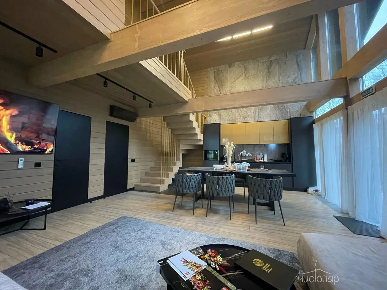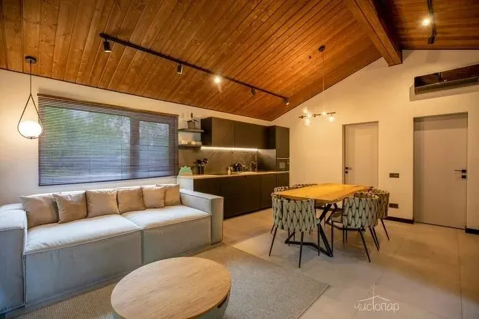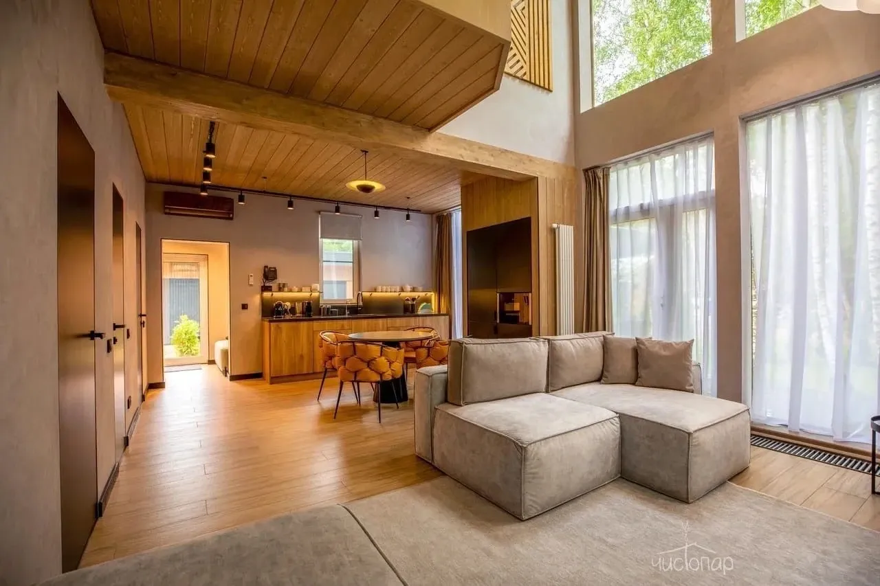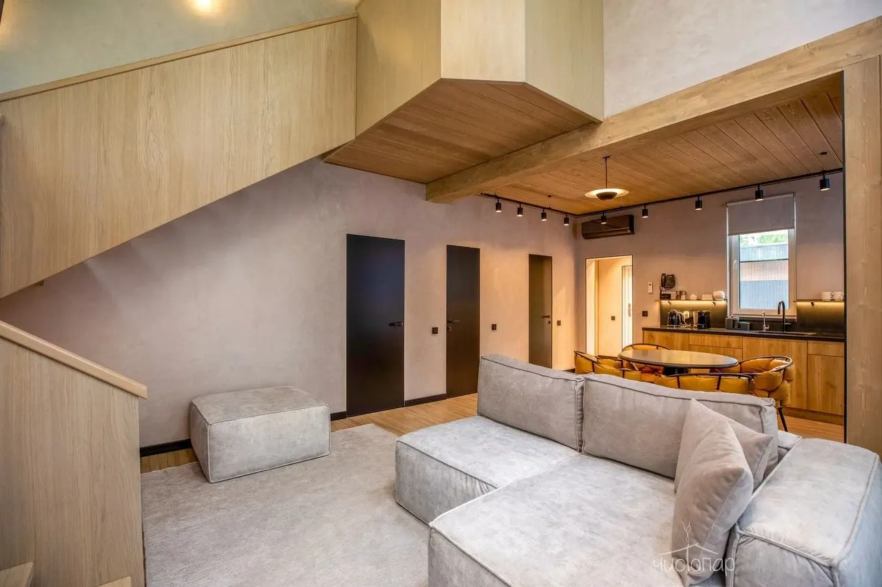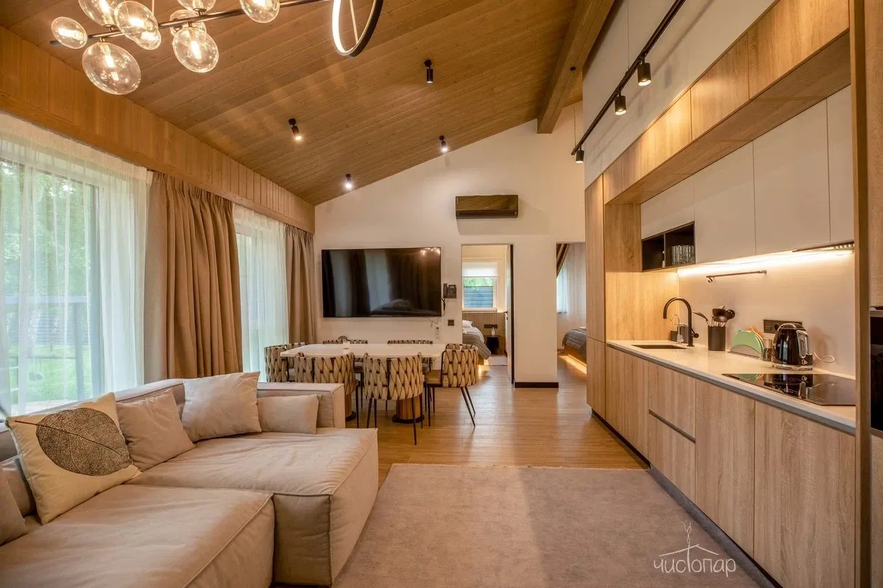 Весь интерьер коттеджа выполнен в теплых песочно-бежевых оттенках. В комнатах уютно и комфортно. В спальнях расположены большие кровати с анатомическими матрасами и мягкими подушками. К услугам гостей постельное белье из натуральных тканей премиум класса. На первом этаже расположена просторная гостиная с полностью оснащенной кухней. В зоне отдыха располагается удобная мягкая мебель и LED-телевизор.