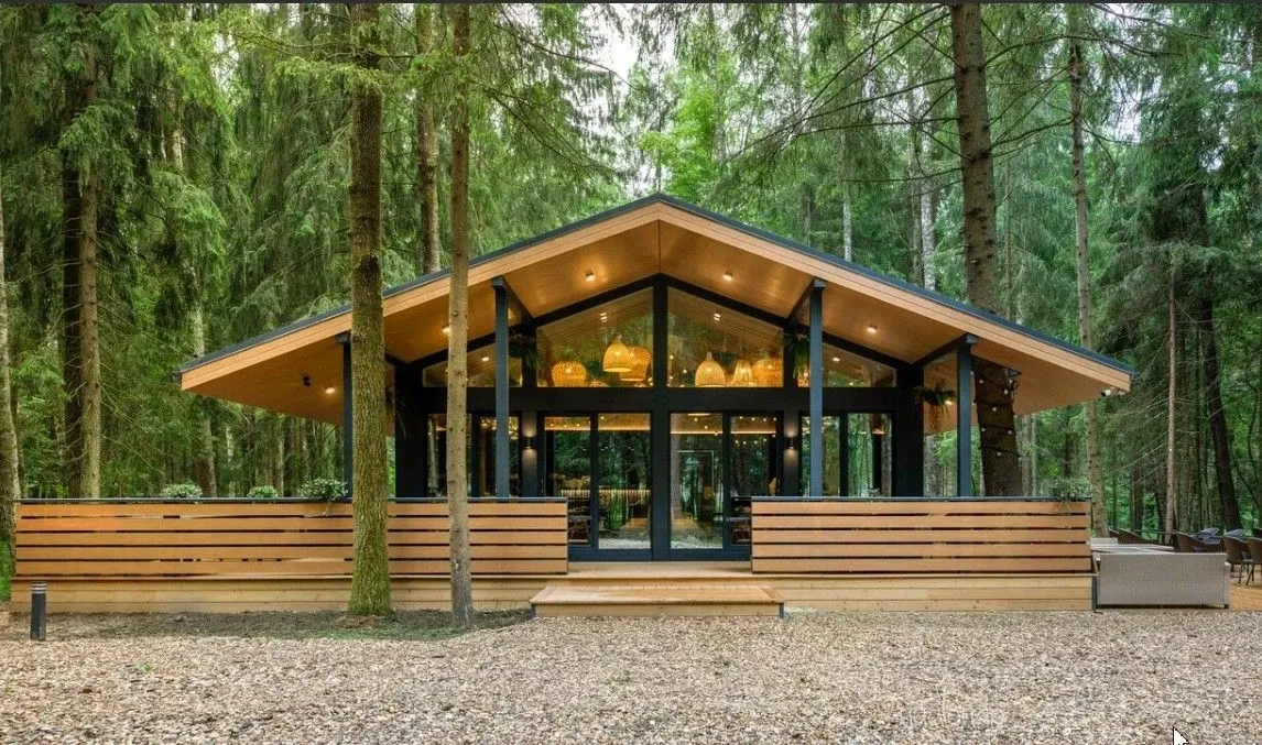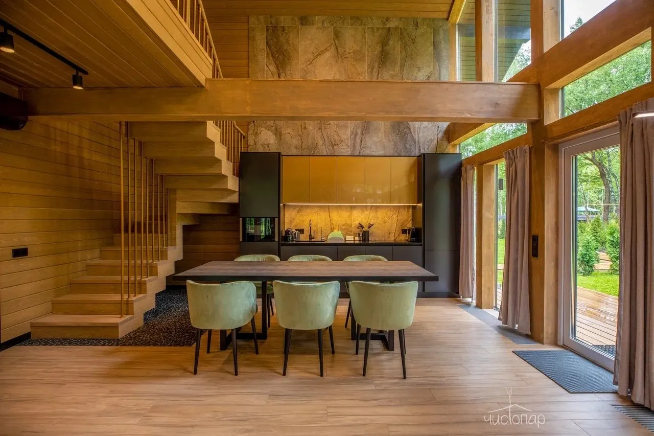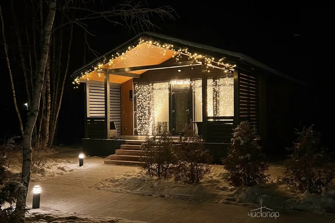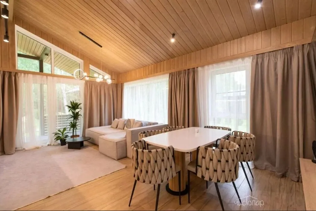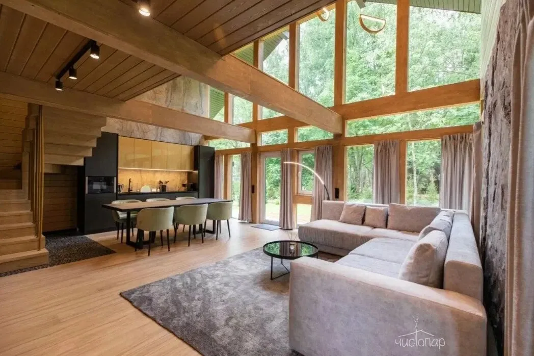 Коттедж 150 кв.м. до 6-ти человекБольшим семейством или с компанией друзей можно комфортно разместиться на двух этажах этого дома. Каркас, облицовка стен и фасада коттеджа выполнена полностью из натуральных материалов. Благодаря огромным панорамным окнам в помещениях много солнечного света, даже в пасмурную погоду в комнатах всегда светло. Из окон открывается прекрасный вид на березовый лес.