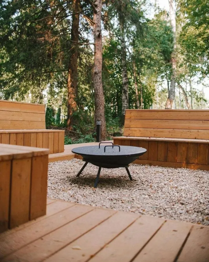 Все коттеджи оборудованы собственной мангальной зоной с углями, очагом и скамейками.