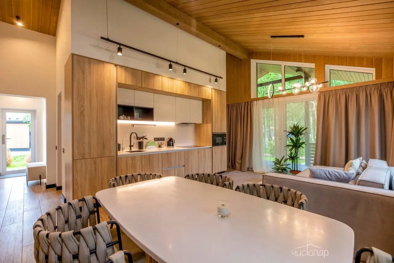 Сердце дома – просторная гостиная. Тут можно собраться всей компанией на мягкой мебели, чтобы пообщаться или посмотреть телевизор, или за обеденным столом. Кухня, обеденная зона, а также зона отдыха объединены в едином пространстве, все лаконично и комфортно. В коттедже есть вся необходимая бытовая техника и комплекты посуды для приготовления любых блюд.