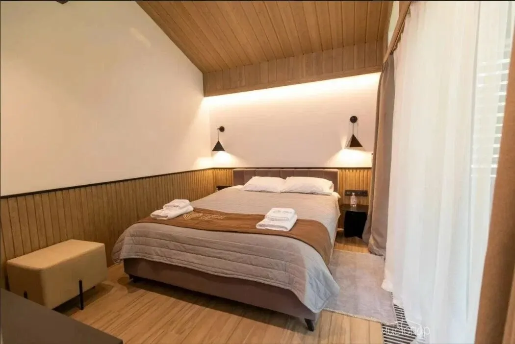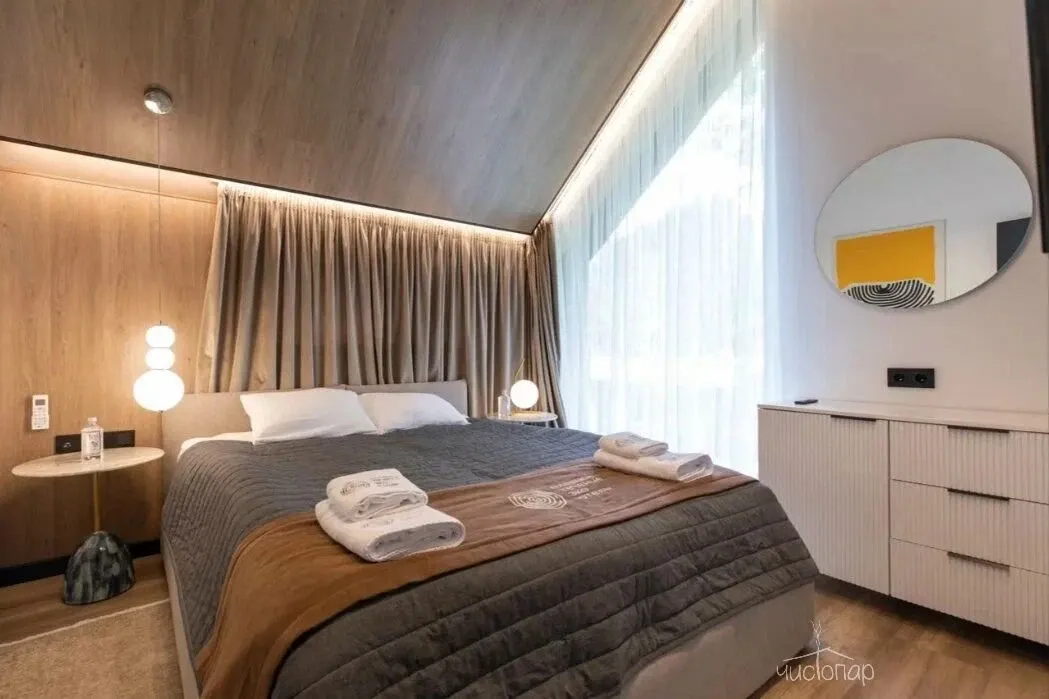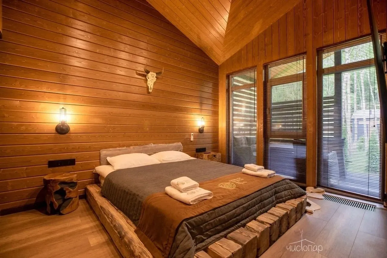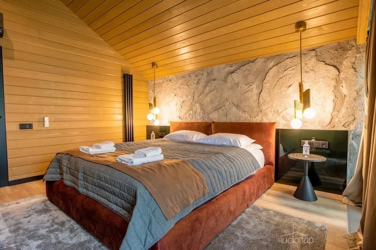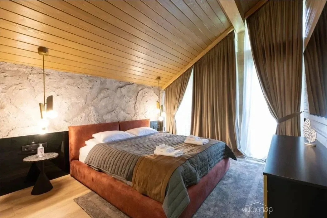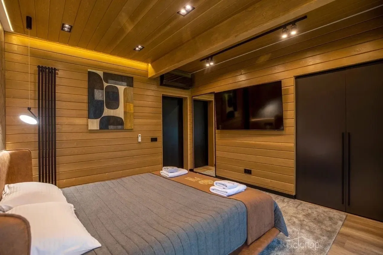 Для отдыха предусмотрены четыре просторные спальни, в каждой из которых установлена большая кровать KING-SIZE с анатомическим матрасом и качественными подушками. Приватные зоны выполнены в спокойной цветовой гамме. Сочетание комфортной мебели, натуральных материалов в декоре и отделке стен, пола и потолка обеспечат отдыхающим хороший сон.