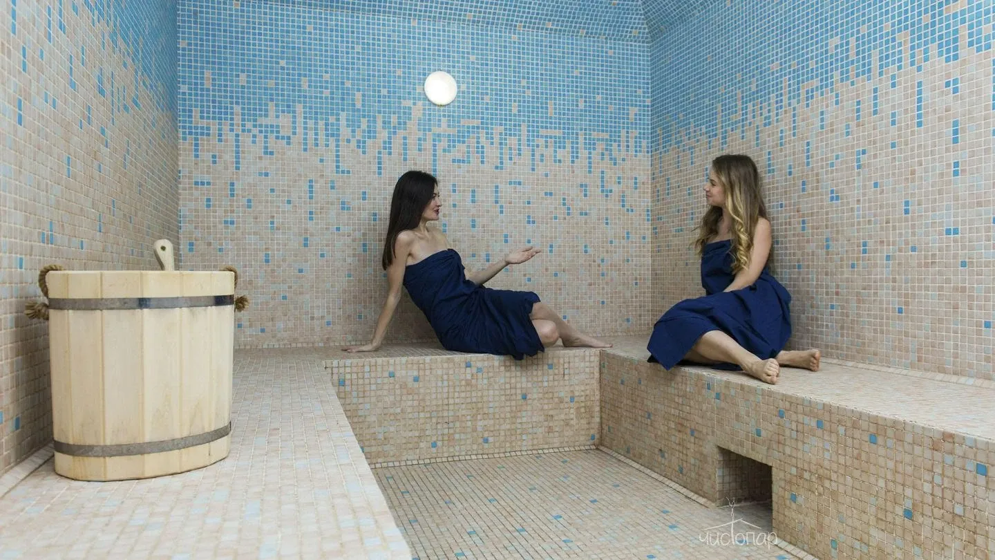 ХаммамХаммам — это парная с высокой влажностью в пределах 80% и при этом невысокой температурой — 40-45 градусов. Хамам способствует очищению, омоложению, укреплению иммунитета, а также помогает восстановить кровообращение, улучшить тонус организму, прогреть мышцы и повысить поступление кислорода к внутренним органам. На 2 этаже сауны расположена просторная зона отдыха с кроватью и бильярдом.