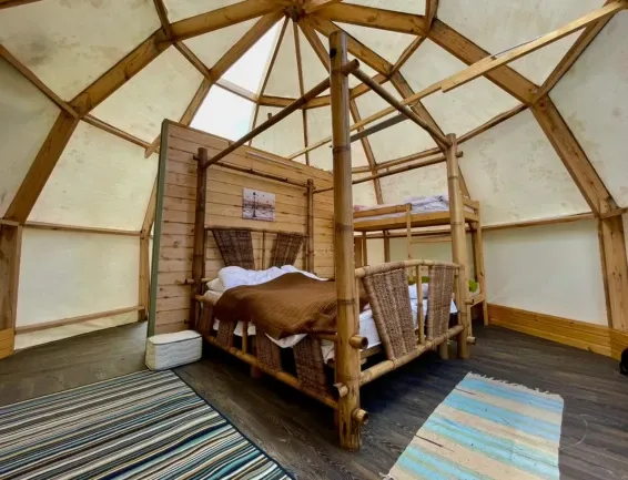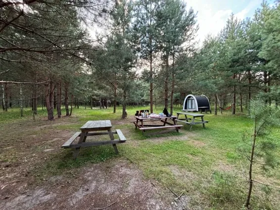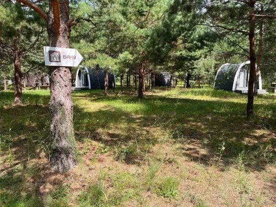 На территории глэмпинга есть русская баня с зоной отдыха в лесу вместимостью до 5 человек.