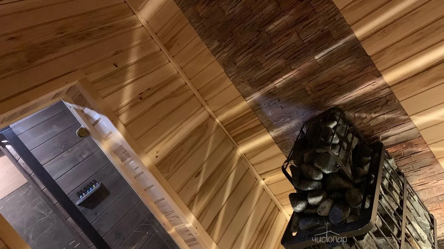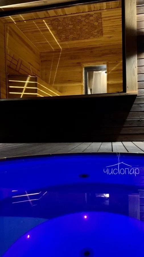 Внутри бани царит особая атмосфера комфорта. Натуральное дерево, использованное в интерьере, создает ощущение тепла и уюта, а современные удобства добавляют нотку современности и функциональности. Вы можете наслаждаться паром и ароматами трав, расслабляться на удобном лежаке или наслаждаться чашкой ароматного чая, любуясь захватывающим пейзажем за окном.