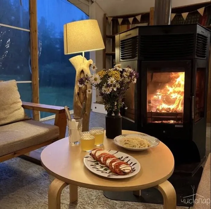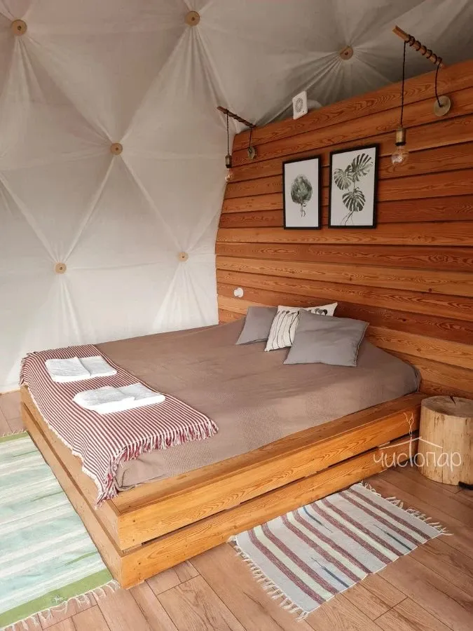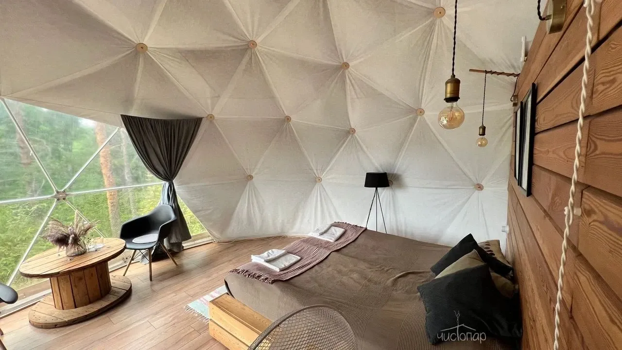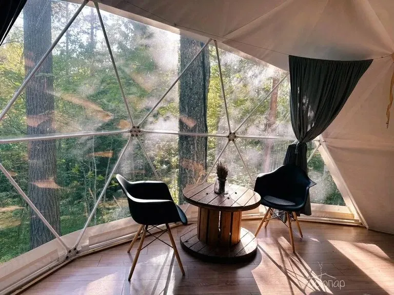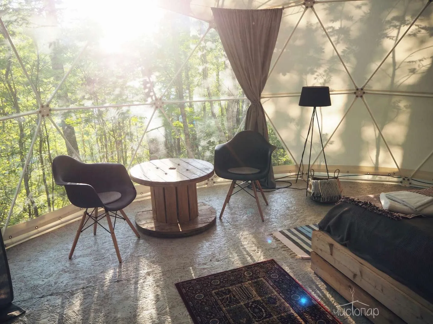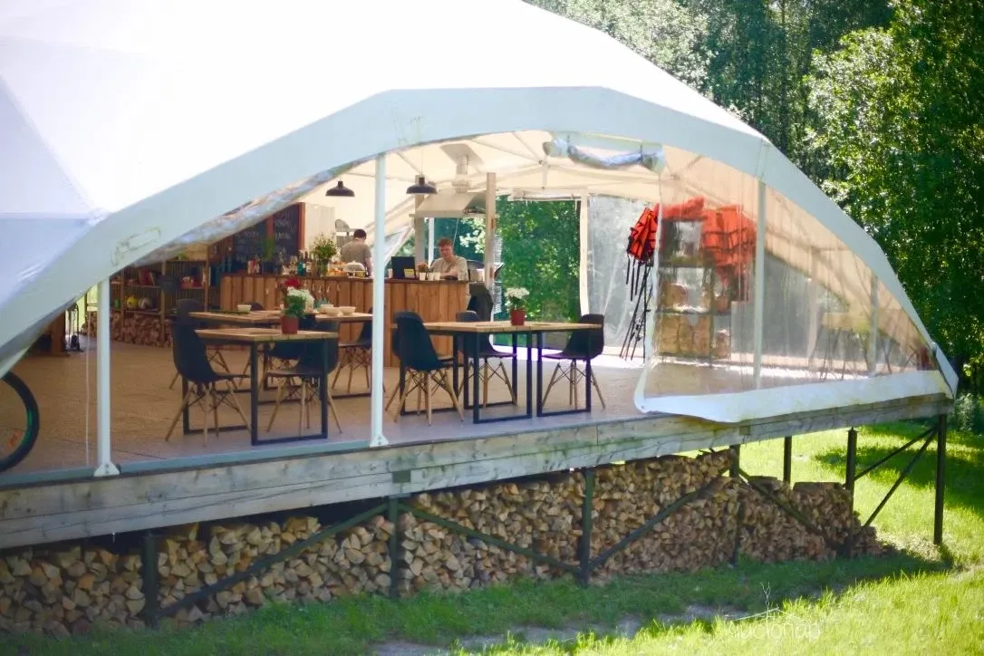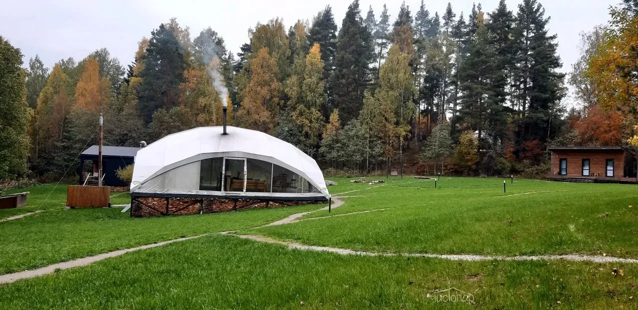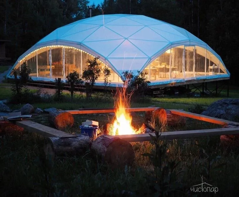 В большом центральном шатре расположен ресепшн, гастробар, где каждый день готовят блюда от шеф-повара, место для отдыха у камина с настольными играми, а также проектор для вечерних киносеансов или презентаций.