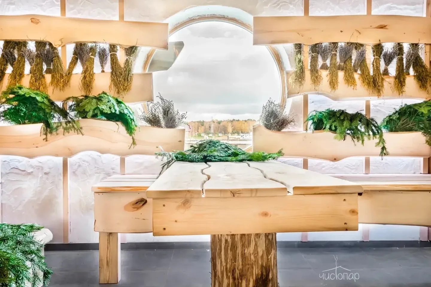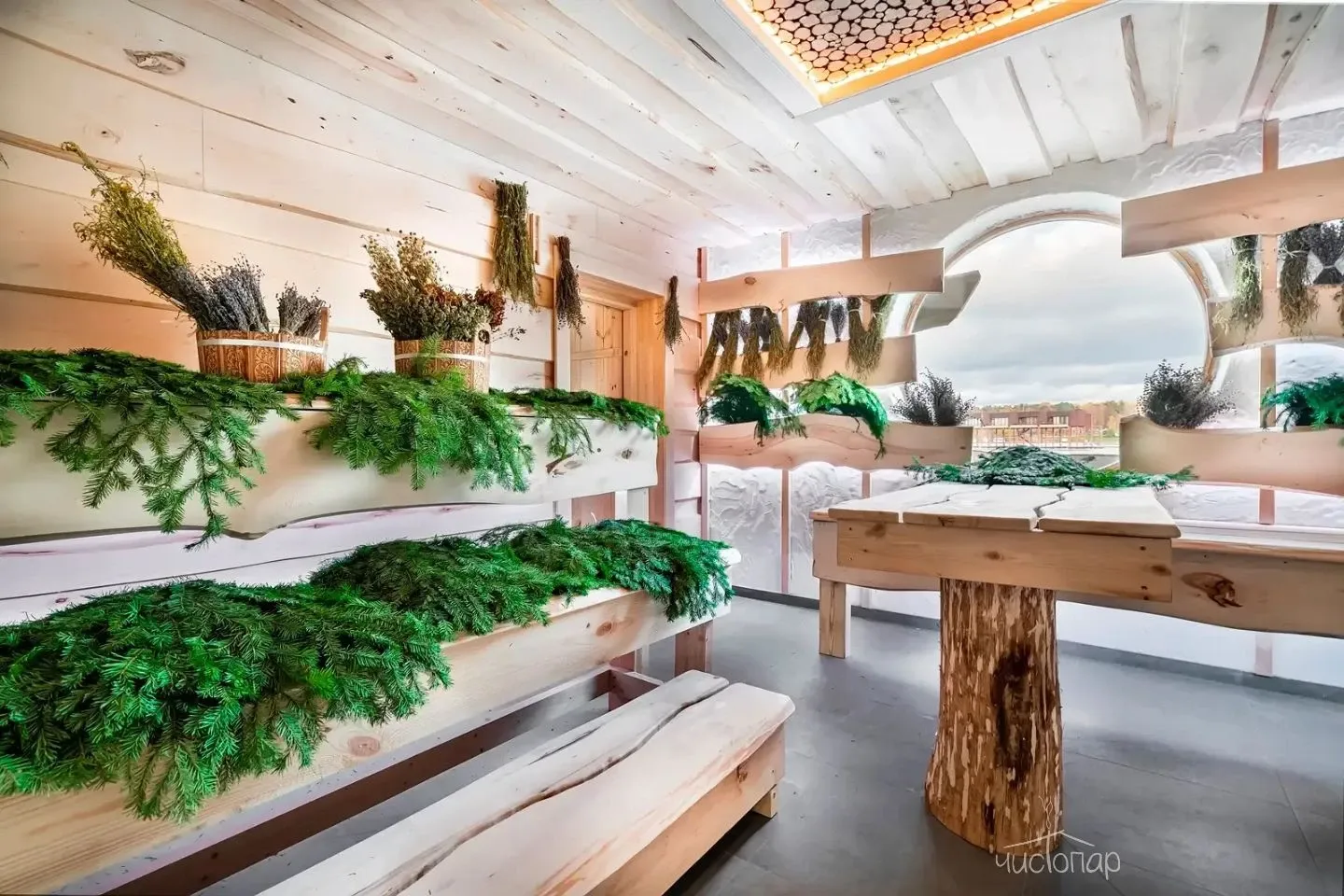 Главная зона каждого коттеджа - деревянная Русская баня с просторной парной из липы со смотровым окном и выходом на террасу.